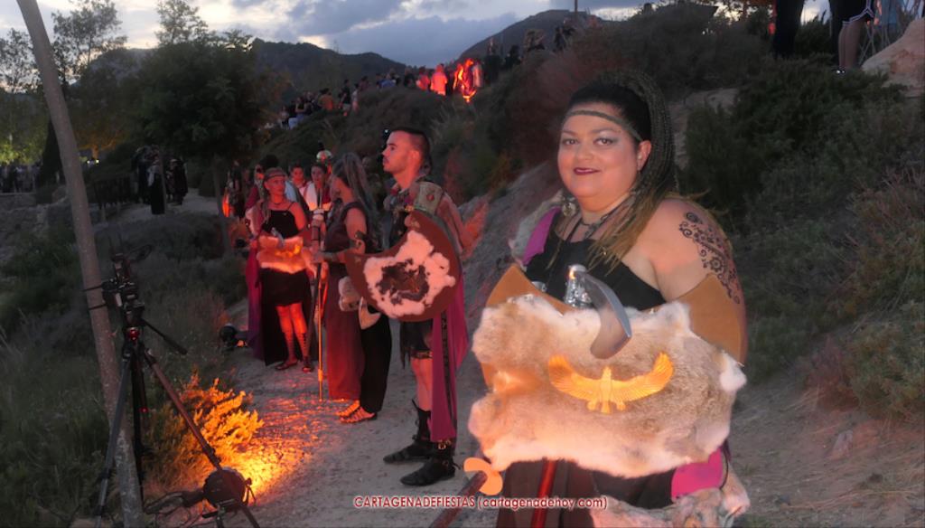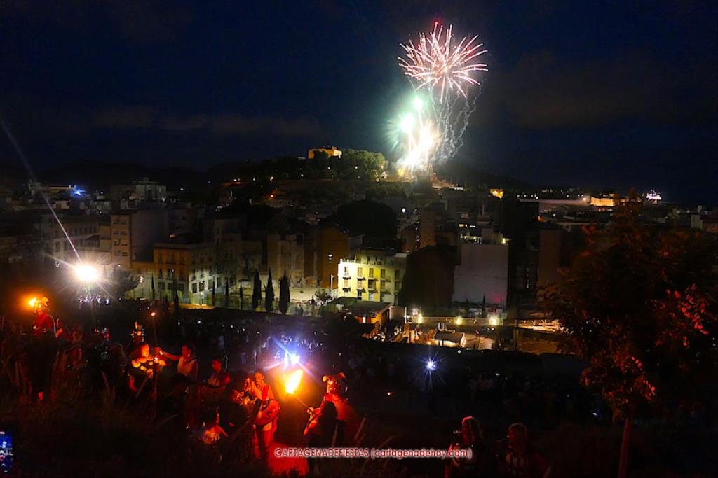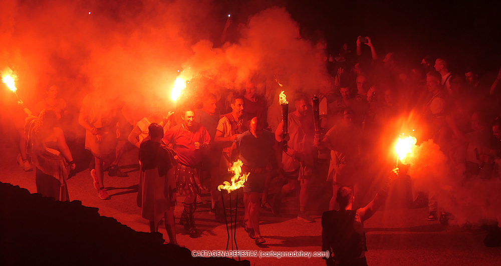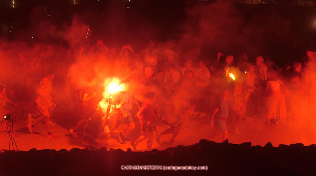 Los porteadores entraron en las primeras rampas de la subida por tierra en una nube de humo rojo, para después entregar las dos antorchas a Gonzalo Verdú y Toché. El primero es un cartagenero que ha jugado con el equipo de su tierra en el fútbol profesional. El segundo, un murciano que ha hecho historia con sus goles también en el balompié local. Ambos son muy queridos por los aficionados.