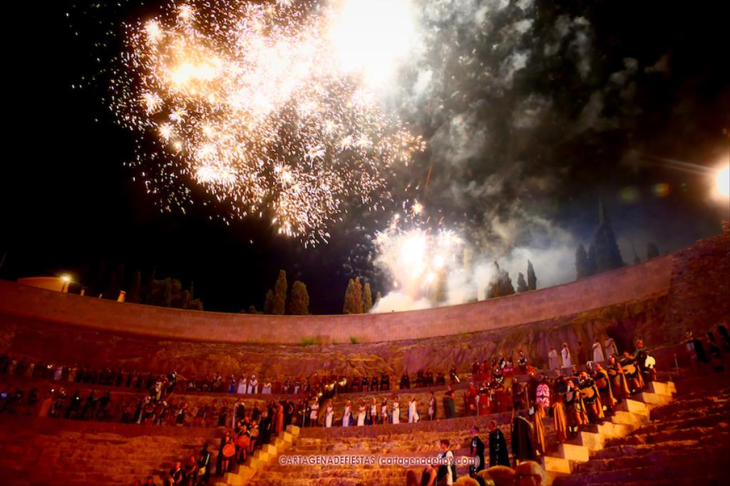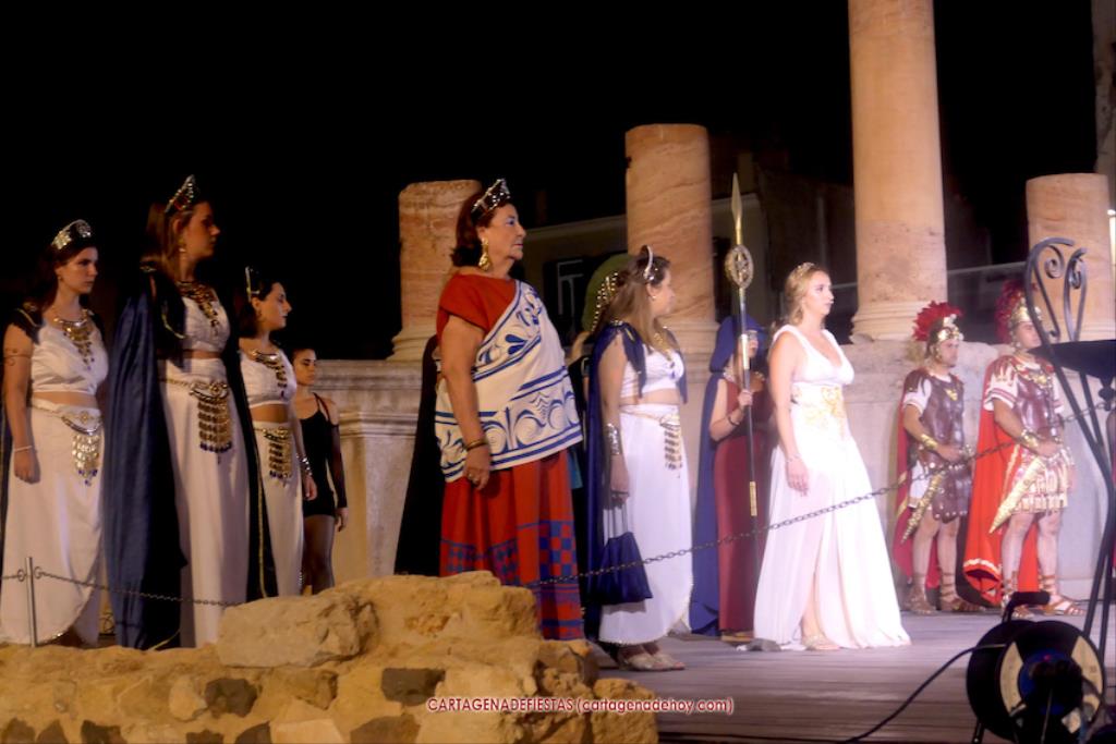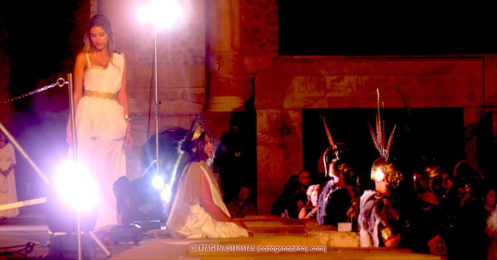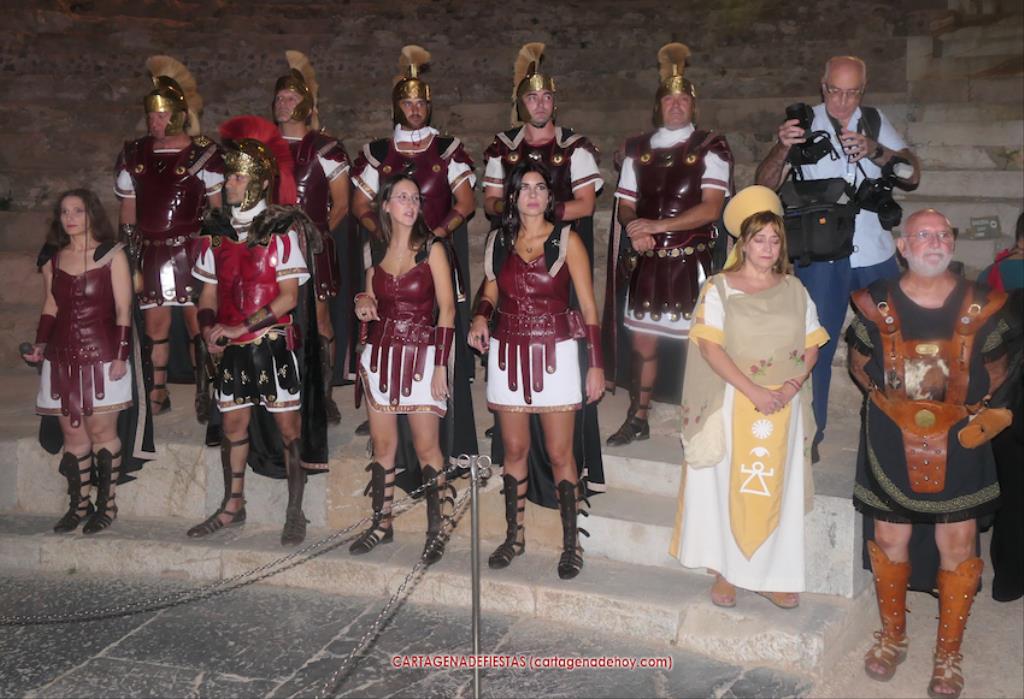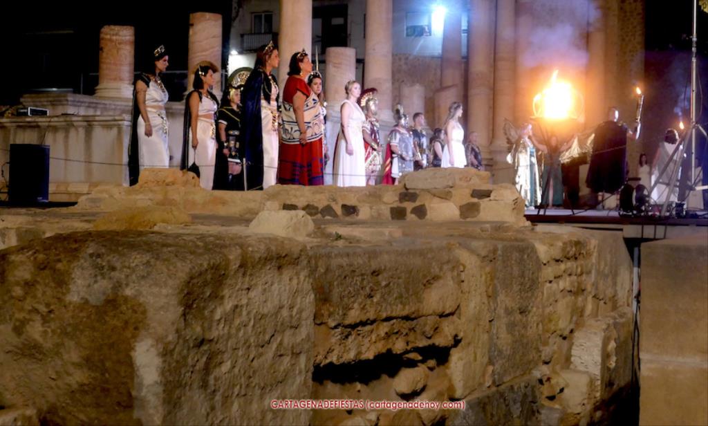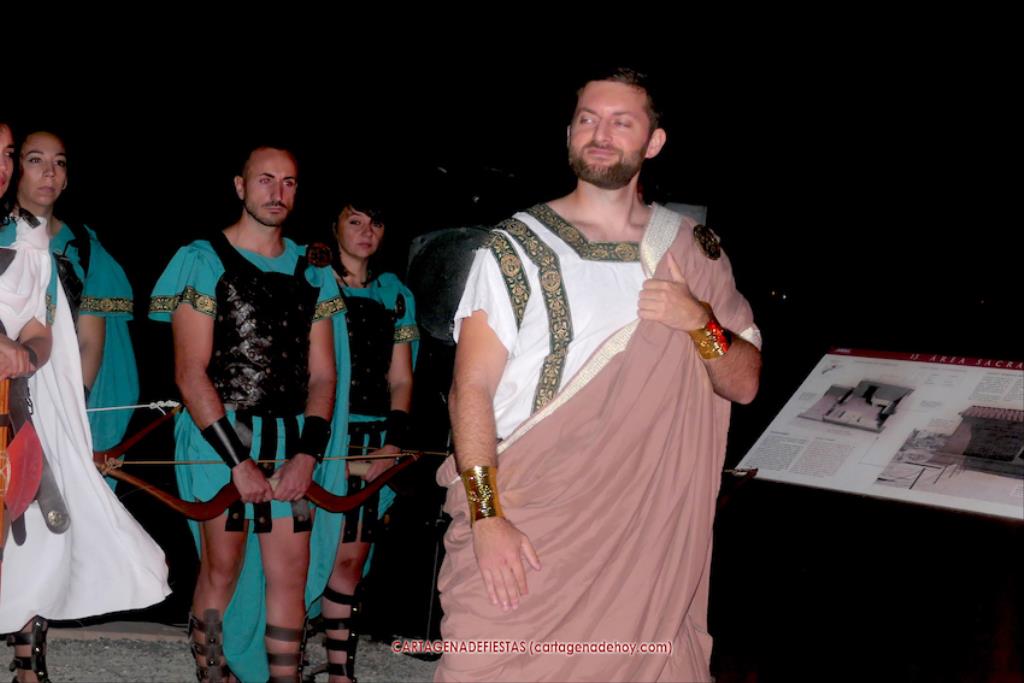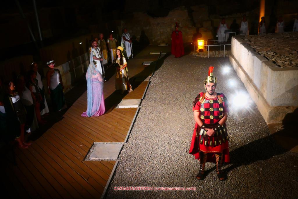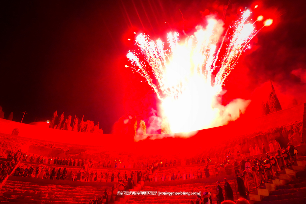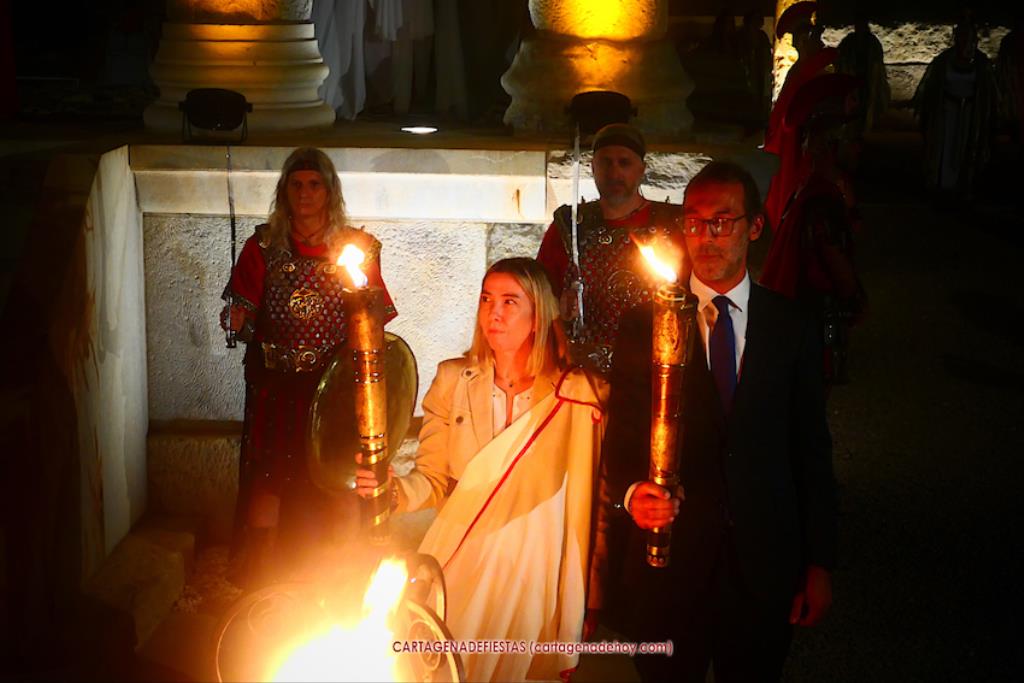 La comitiva continuó por el casco histórico hasta el Teatro Romano, donde recogieron la llama su director, Elena Ruiz, y el vicepresidente de Tropas y Legiones, Eduardo Conesa, para, tras otro acto en escena, encender el tercer pebetero. Otra vez se inició otro trayecto, en el que, entre otras autoridades, se incorporó como portadora la alcadesa, Noelia Arroyo, llegando la llama al pebetero del Palacio Consistorial, donde tuvo lugar la presentación de tropas, legiones y personajes, además del pregón. A su conclusión, rumbo al campamento. Destacar también el protagonismo de los fuegos de artificio. Los primeros ascendieron desde el Castillo de la Concepción y también lucieron los que aparecieron por detrás de la parte superior del graderío del Teatro Romano. También luces y colores estallaron en el cielo después en la llegada al campamento.
