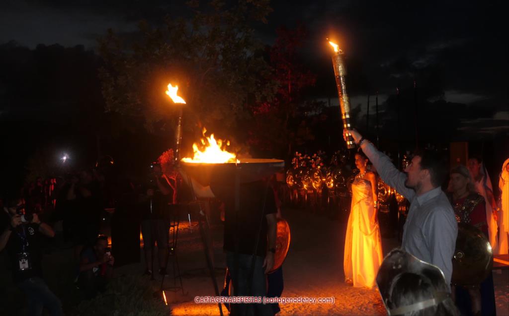 Cartagena de Fiestas (Cartagena de Hoy), el periódico más festero, ha ido informando del recorrido del fuego sagrado en sus salidas desde Linares y de Santomera, además del tránsito por las localidades de Jaén y de Granada. Ayer lo esperamos en Cartagena y cuando se fusionaron los portadores de ambos recorridos (tiene un artículo propio en este diario). A partir de entonces fueron paralelas las dos llamas desde la sede federativa de la Serreta hasta lo alto del Molinete, lugar que ayer también estrenaba iluminación su restaurado molino.