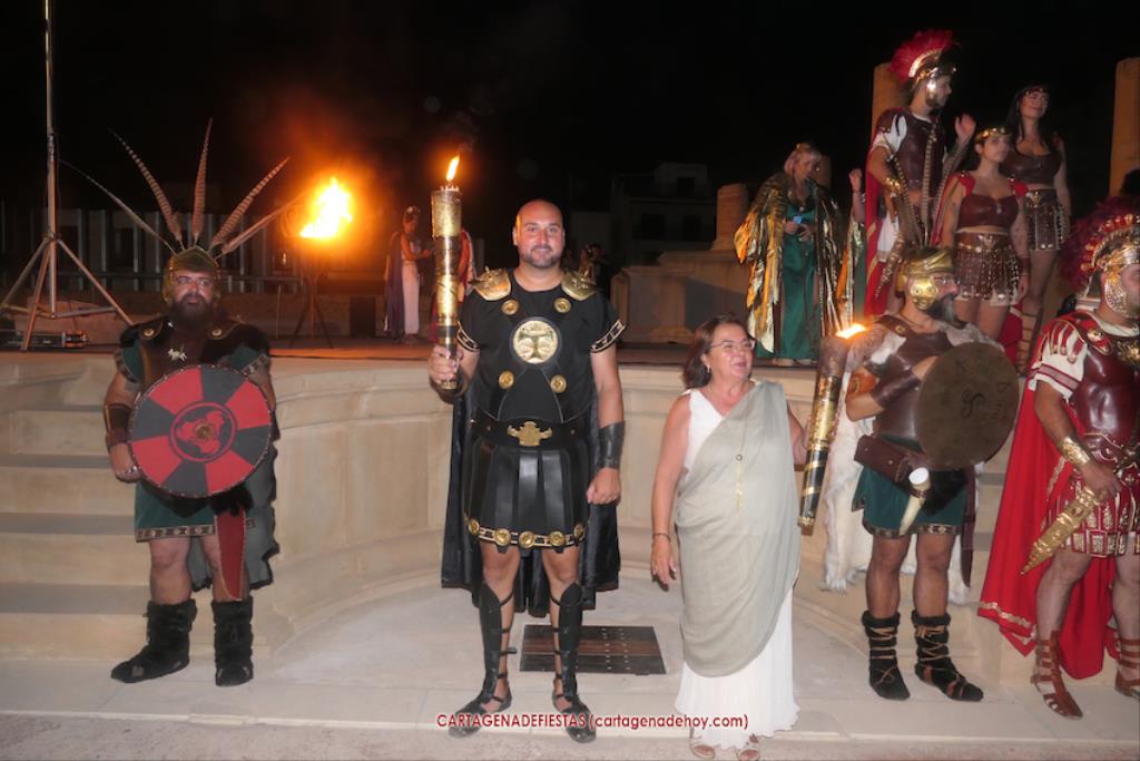 Los dos exfutbolistas, quienes han dejado huella en el fútbol cartagenero, fueron los últimos portadores de las dos llamas sagradas en su primera escala en la ciudad, que después continuó, con otros protagonistas, en el Foro y el Teatro Romano, en una jornada con novedades en la puesta en escena y retraso en los tiempos fijados.