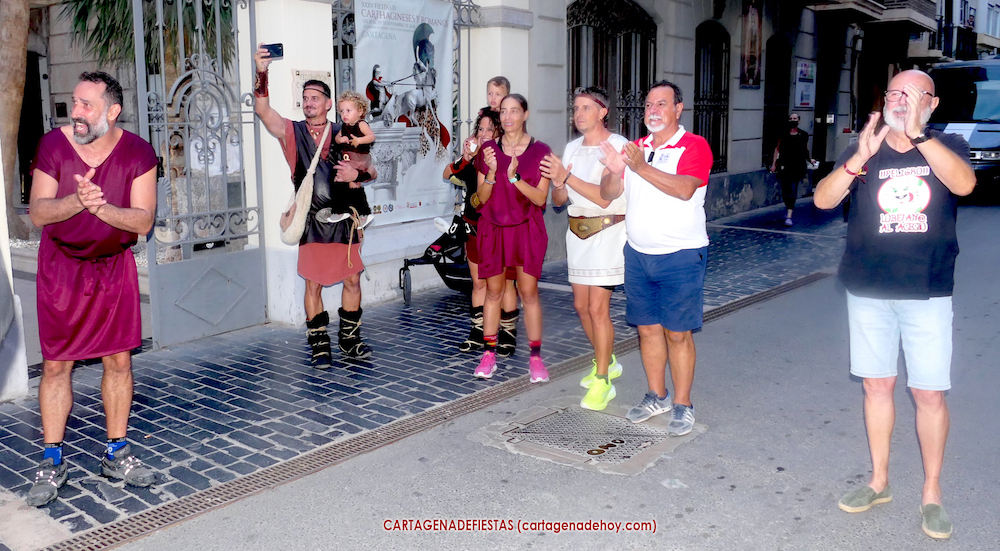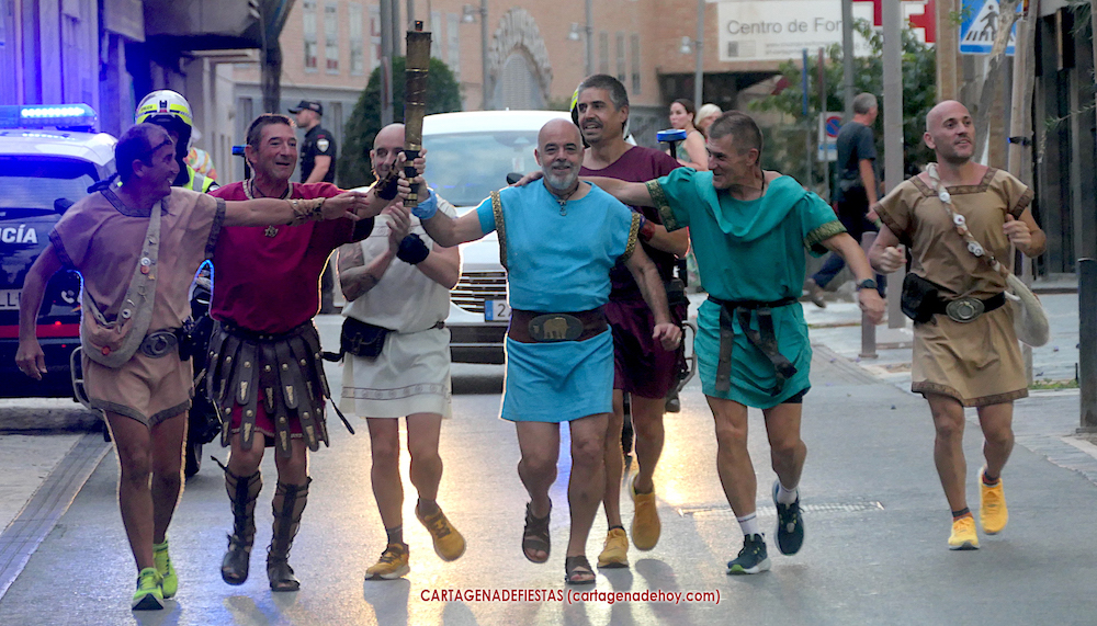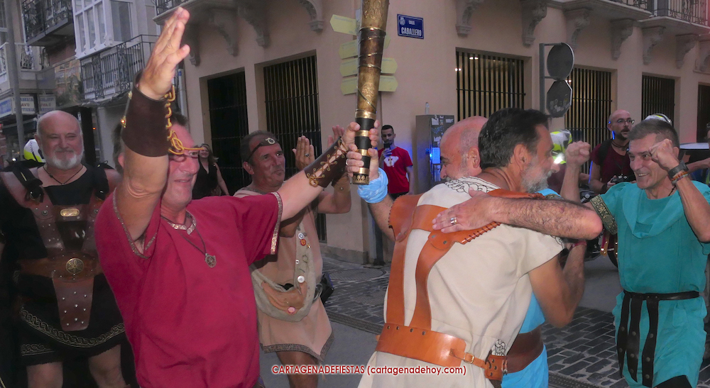 Los portadores de las dos antorchas con el fuego de Carthagineses y Romanos estallaron de júbilo ante la sede de la Federación de Tropas y Legiones cuando se encontraron las que llegaron ayer a Cartagena por tierra desde Santomera y la que lo hizo por mar desde Águilas después de haber cruzado las provincias de Jaén y Granada.