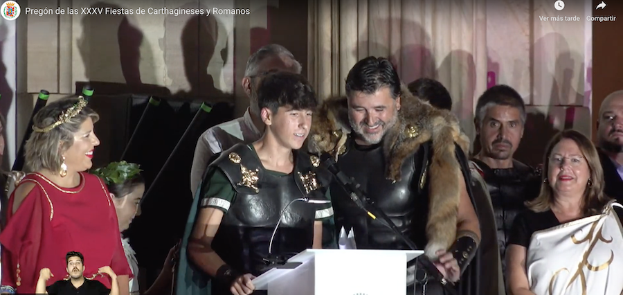José Antonio, durante su alocución en el acto del pregón, contó con el refuerzo de sus hijos. Primero fue Pablo quien entonó el "¡Viva Carthagineses y Romanos!", para a continuación ser su hijo quien lo hizo con "¡Viva Cartagena... y Arde Bogotá!".