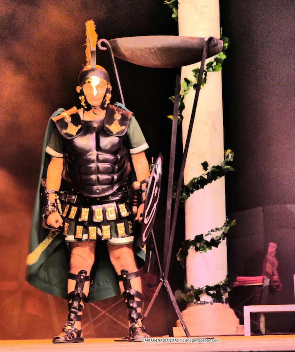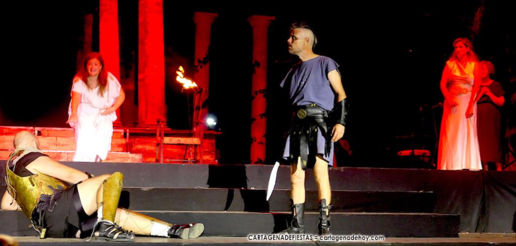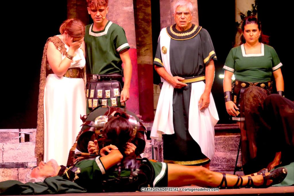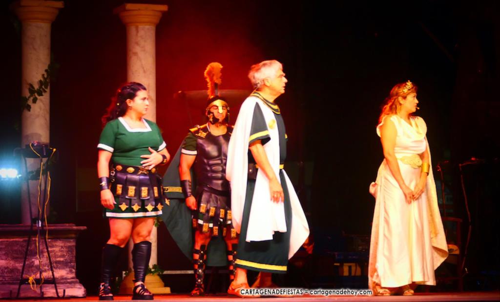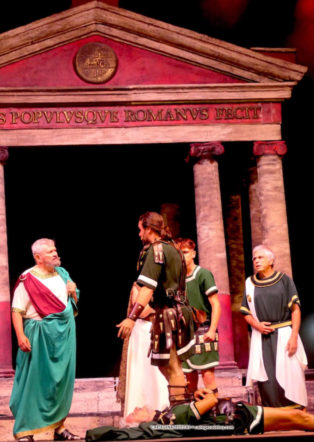 La IA ya está en las históricas fiestas de Cartagena. Su primer acto de presencia (s.e.u.o.), lo ha hecho a través de la representación de la 'Destrucción de Sagunto' con la rockera canción que acompañó al saludo de los actores tras acabar la puesta en escena, que en esta ocasión tuvo, por primera vez también, a Juanjo Núñez con la 'batuta' de dirección, además de interpretar a Valerio (antes Teucro), que este año fue el último legionario en morir.