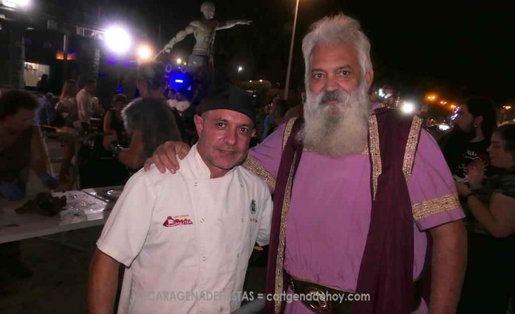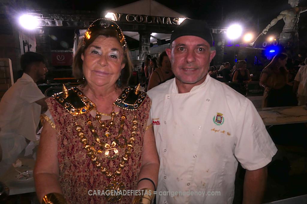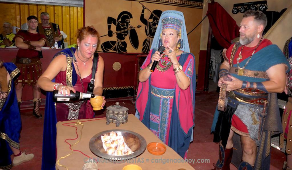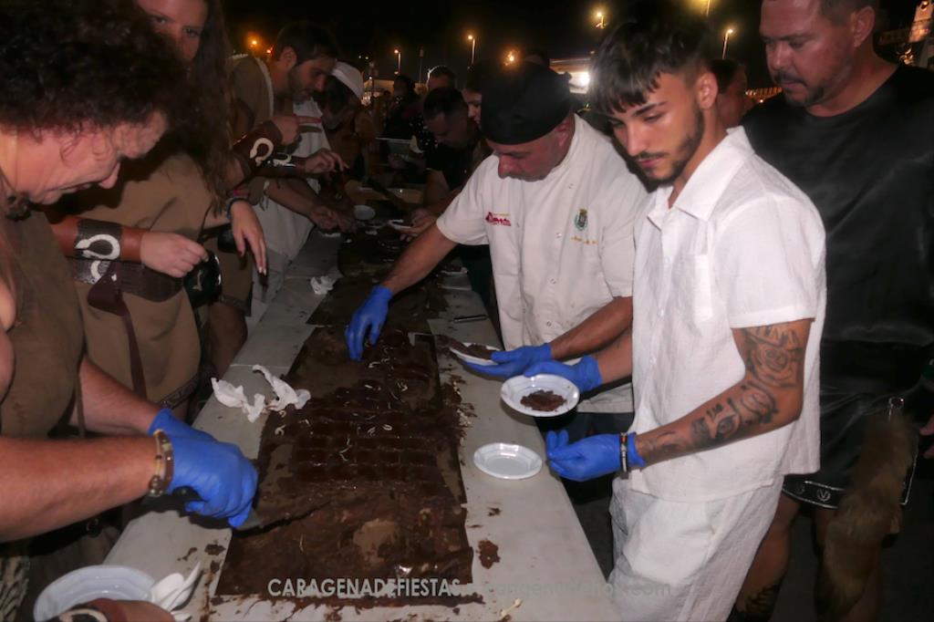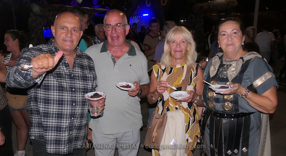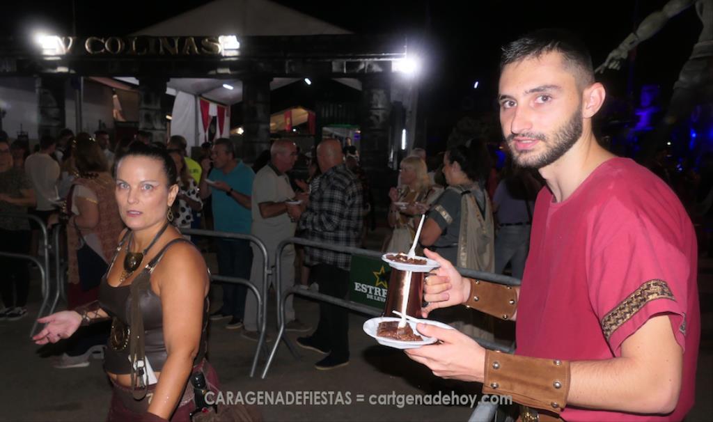 Tras la esplendorosa boda que tuvo lugar en el puerto de Cartagena, el siguiente capítulo para los ya ‘Señores de Qart-Hadast’ fue acudir al campamento de Carthagineses y Romanos por la calle púnica, donde esperaba una gran tarda de chocolates negro y blanco elaborada por Ángel Urán, la cual fue repartida por Julio Guillamón y Esther Escolar (o viceversa), con ayuda de un pequeño destacamento, entre festeros y visitantes.