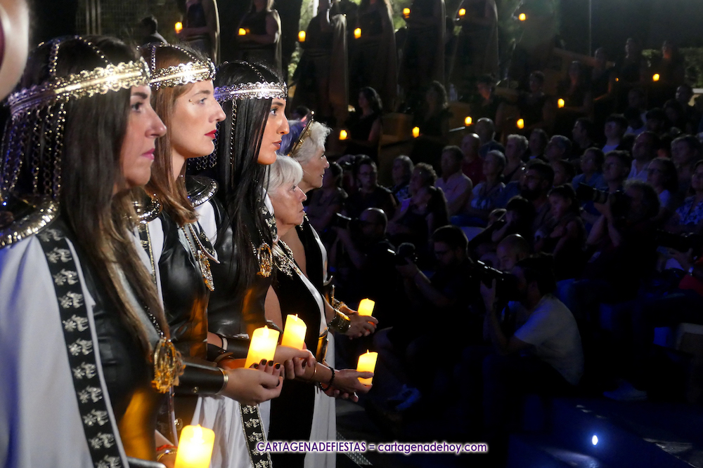Se vacía el templo y llega Himilce (Esther Escolar) bajando con plena solemnidad la escalinata de un graderío franqueado por decenas de carthaginesas con velas, ofreciendo el conjunto una enorme vistosidad.