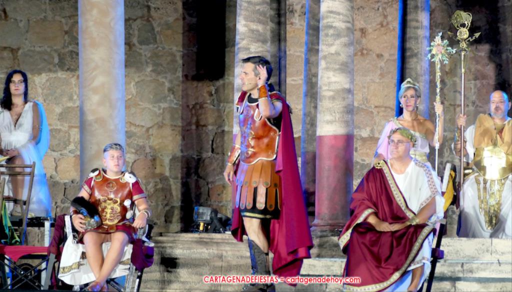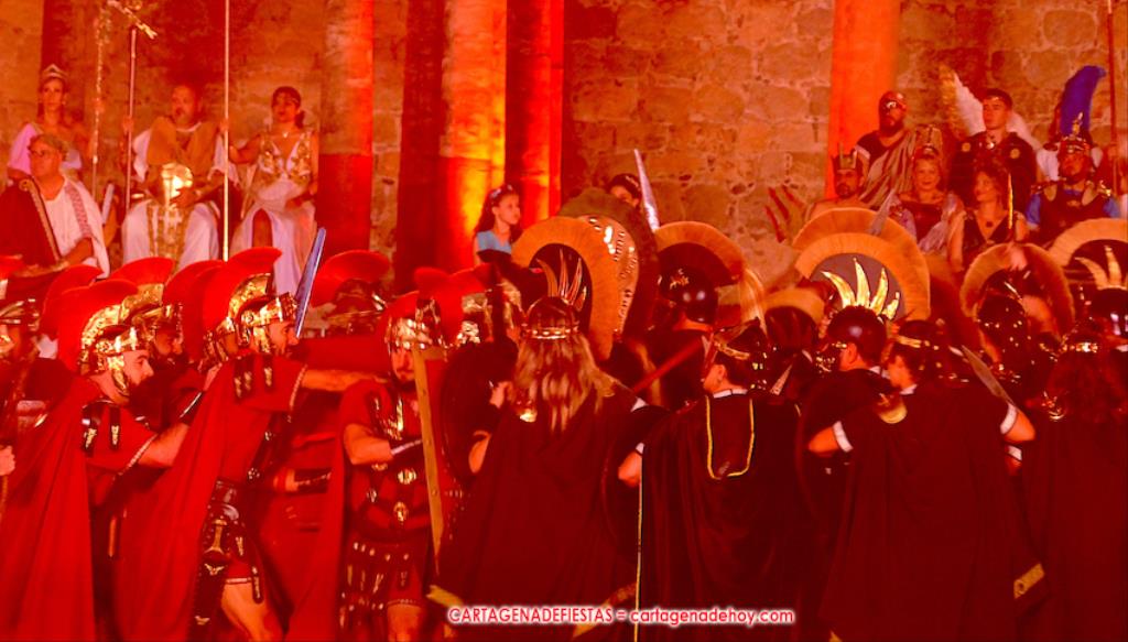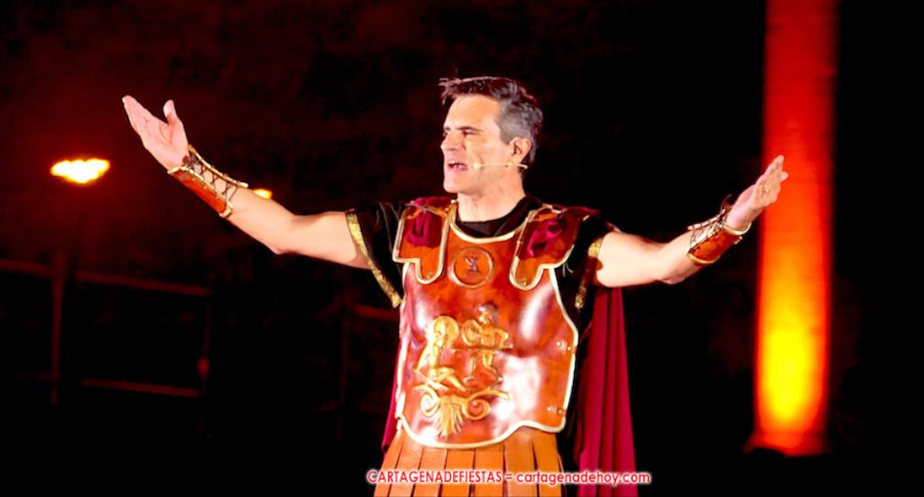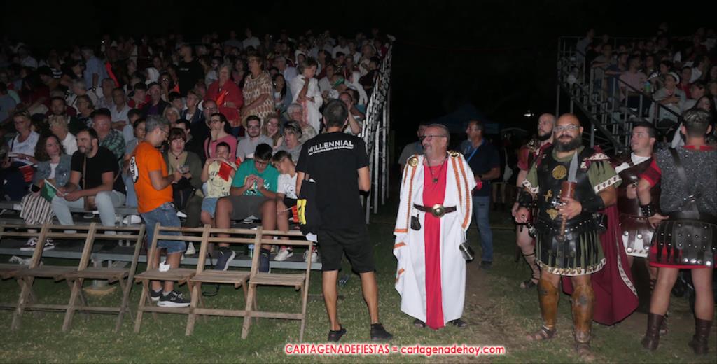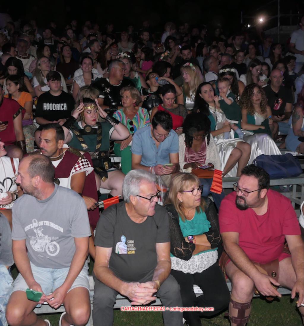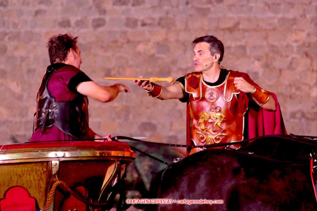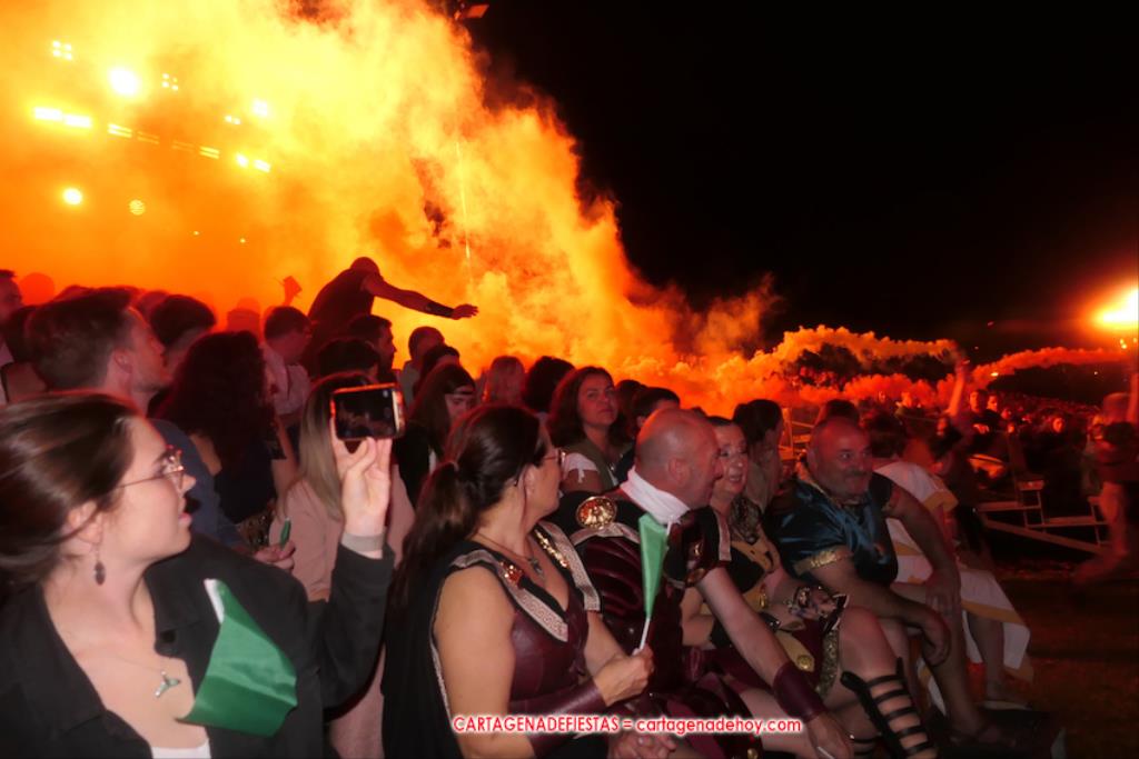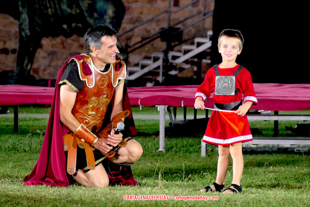 Todavía queda algo de la crónica, el presentador. Me gustó cómo llevó la presentación Luis Larrodera. Se nota que tiene recursos para salir de cualquier situación (cuando se perdió una bandera) y para arrancar sonrisas con chascarrillos o un chiste, como el que lanzó: ¿Por qué los romanos no llevan tirantes? Porque son más de centuriones. Autobautizado como 'Achus Pijus Magnífico', auspició una gran 'ola' con retorno y utilizó una improvisada entrevista a Escipión y Emilia Paula para divulgar tesoros de nuestra gastronomía: michirones, caldero y asiático. Luego, es de suponer que en un apartado pactado, se dirigió a 'la gobernardora' (la alcaldesa) y al 'emperador' (presidente del gobierno regional), diciéndole a López Miras si había venido "bien o en tren", lo que arrancó muchos aplausos por el olvido ferroviario que tiene esta tierra. "A orillas del Mediterráneo hay un pueblo que no quiere ser más que los demás, pero tampoco menos", expresó. Larrodena tenía libertad para interactuar con el público y en una de sus iniciativas aportó al espectáculo el momento de mayor ternura y simpatía. Sacó de las primeras filas al pequeño festero Nacho, de Rehenes de Carthago, quien, con cinco años de edad, cautivó a todos.