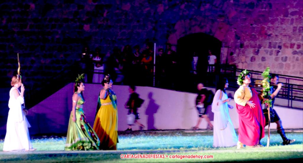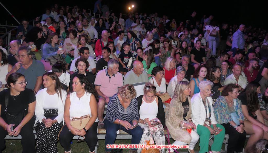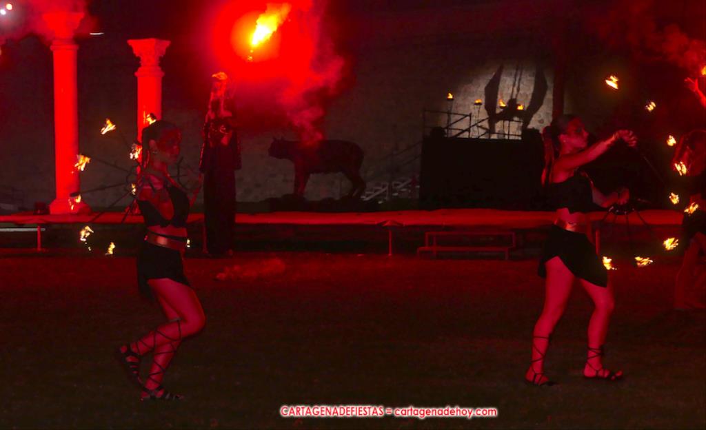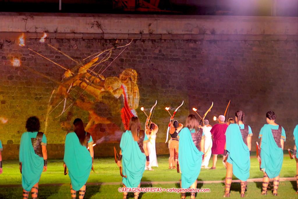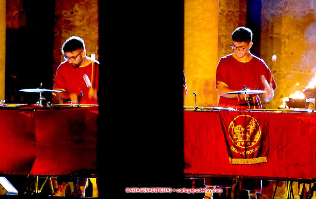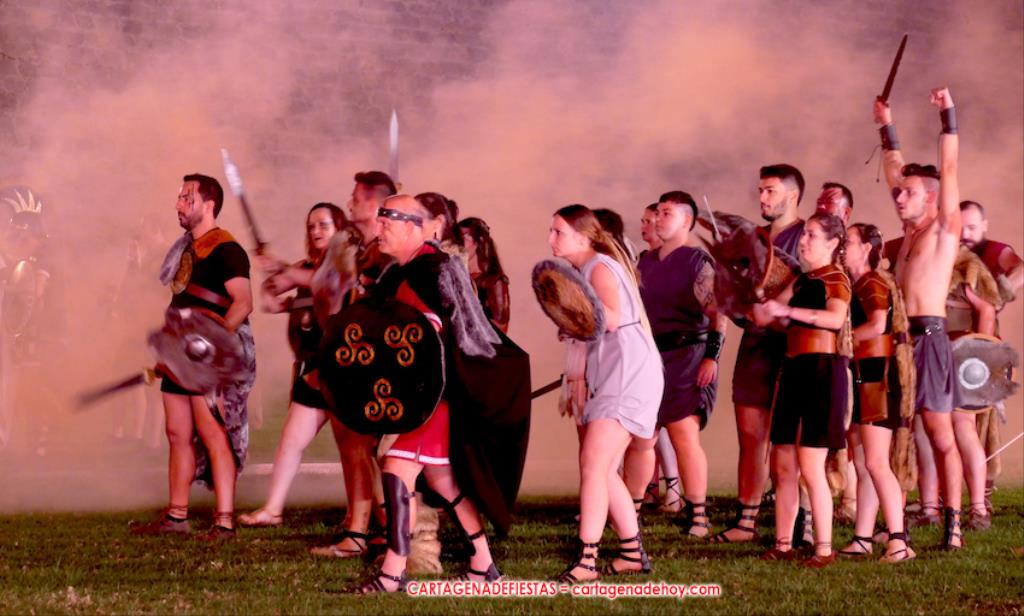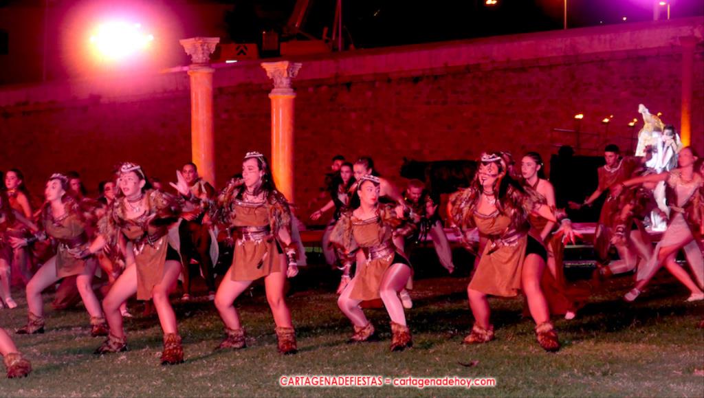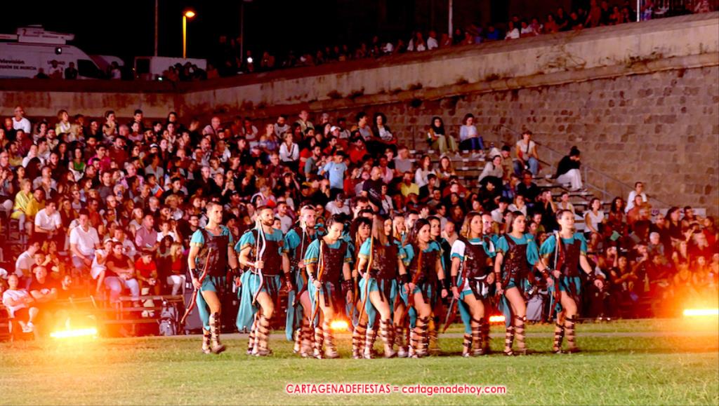 Todavía queda algo de la crónica, el presentador. Me gustó cómo llevó la presentación Luis Larrodera. Se nota que tiene recursos para salir de cualquier situación (cuando se perdió una bandera) y para arrancar sonrisas con chascarrillos o un chiste, como el que lanzó: ¿Por qué los romanos no llevan tirantes? Porque son más de centuriones. Autobautizado como 'Achus Pijus Magnífico', auspició una gran 'ola' con retorno y utilizó una improvisada entrevista a Escipión y Emilia Paula para divulgar tesoros de nuestra gastronomía: michirones, caldero y asiático. Luego, es de suponer que en un apartado pactado, se dirigió a 'la gobernardora' (la alcaldesa) y al 'emperador' (presidente del gobierno regional), diciéndole a López Miras si había venido "bien o en tren", lo que arrancó muchos aplausos por el olvido ferroviario que tiene esta tierra. "A orillas del Mediterráneo hay un pueblo que no quiere ser más que los demás, pero tampoco menos", expresó. Larrodena tenía libertad para interactuar con el público y en una de sus iniciativas aportó al espectáculo el momento de mayor ternura y simpatía. Sacó de las primeras filas al pequeño festero Nacho, de Rehenes de Carthago, quien, con cinco años de edad, cautivó a todos.