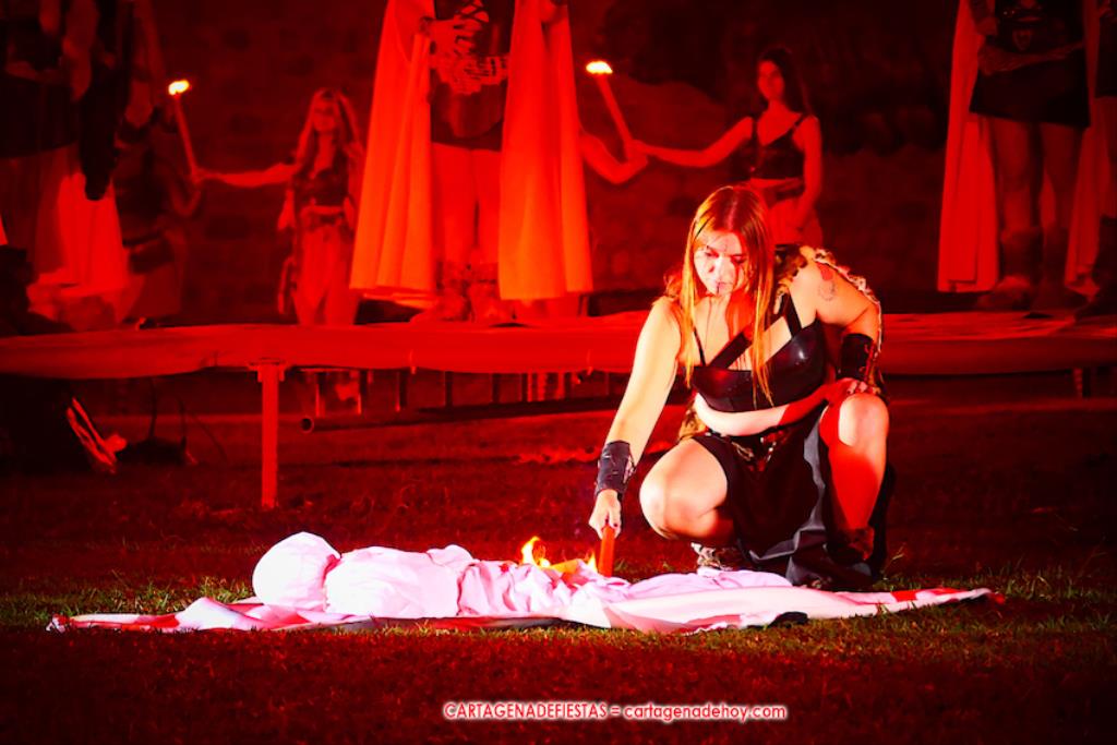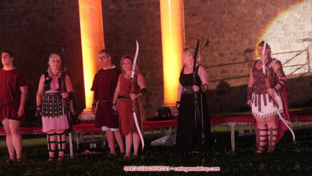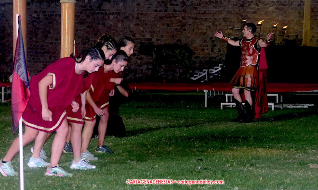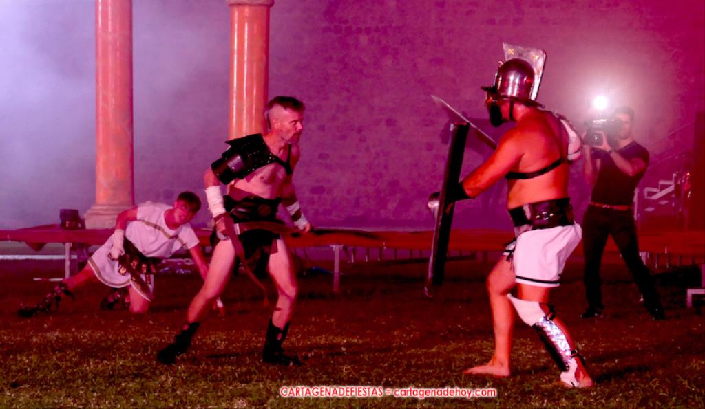 V. ROMA AT ETERNA. Turno para la competición con dos carreras, entre cuyos participantes (todos atletas del UCAM Cartagena) estaban dos promesas del atletismo cartagenero, ahora en edad sub-20, Eva Ibarra y Jaime Mendoza. La carrera que ganó ella arrancó numerosos aplausos por la velocidad que cogió. A su conclusión llegaron legionarios con esclavos, quienes lucharon entre sí en el circo. Los vencedores se enfrentaron después a los afamados gladiadorses. '¡Pugnate!'. Triunfó Atilius, pero el publico instó al cónsul a salvar la vida (vita) del esclavo que se metió en la final. Después, el gladiador le entregó la espada de madera de la libertad.