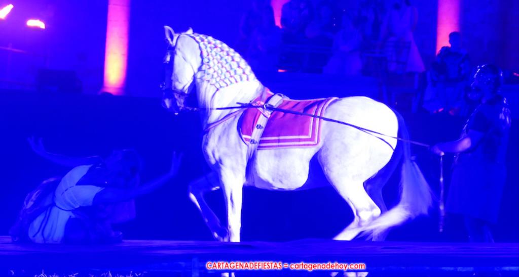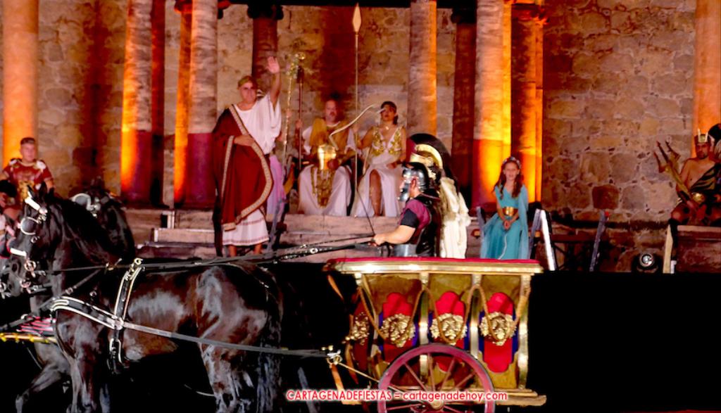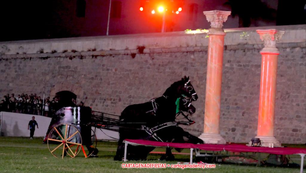 IV. POTESTAS MILITARIS. En este capítulo tuvo lugar la entrada de Escipión y Emilia Paula (con rostro de ir temerosa) en una cuádriga tirada por el cartagenero Agustín Solano (su cuadra cubrio el capítulo equino del Circo). En este momento se había cumplido una hora de ameno espectáculo. A continuación entraron doscientos festeros de las 25 legiones a golpe de tambor y con saludas al cónsul, para a continuación tener lugar una batalla, cuya mejor imagen dejaron los jinetes a caballo.