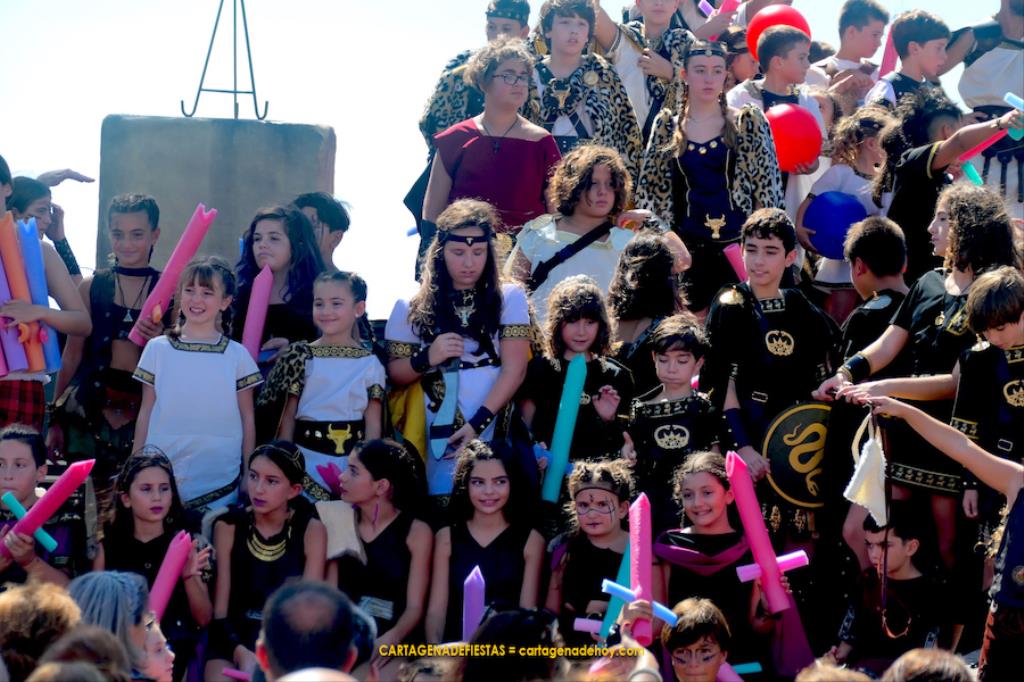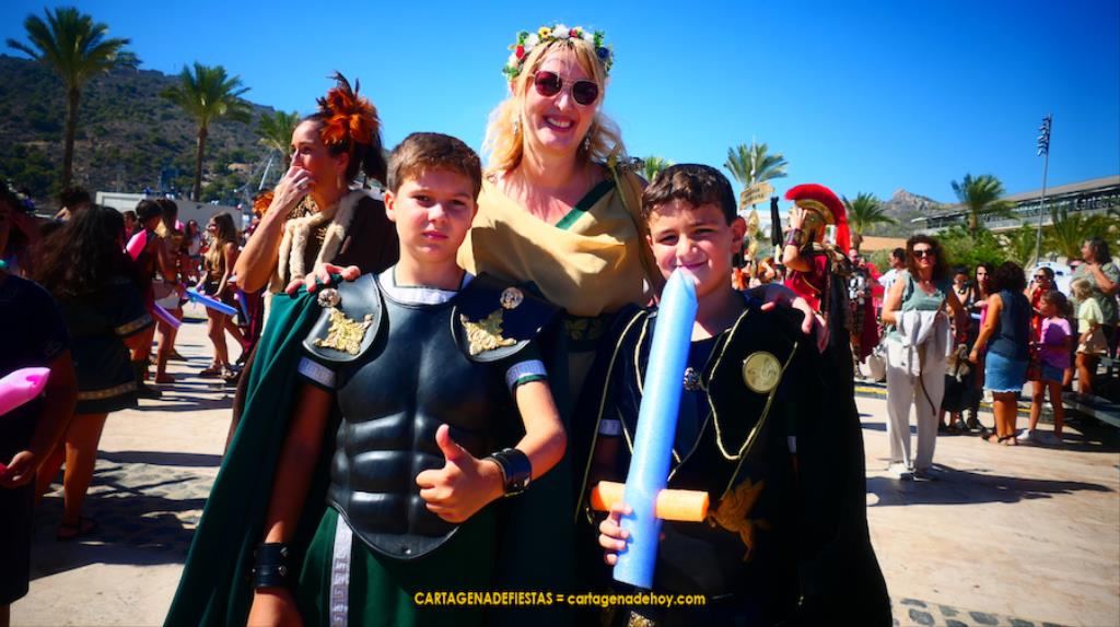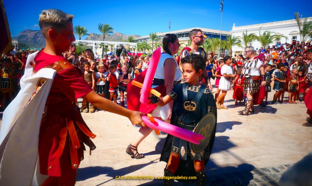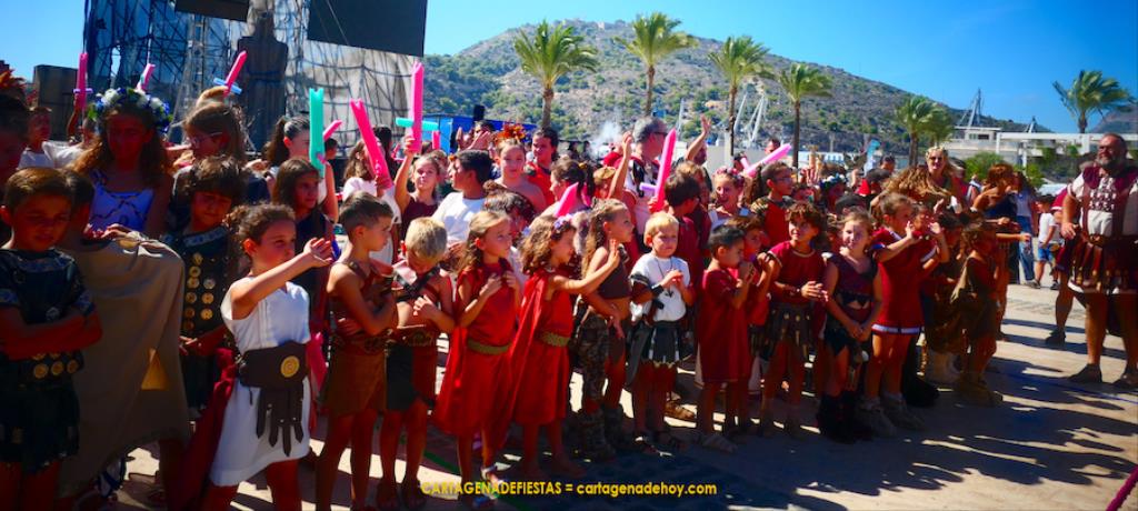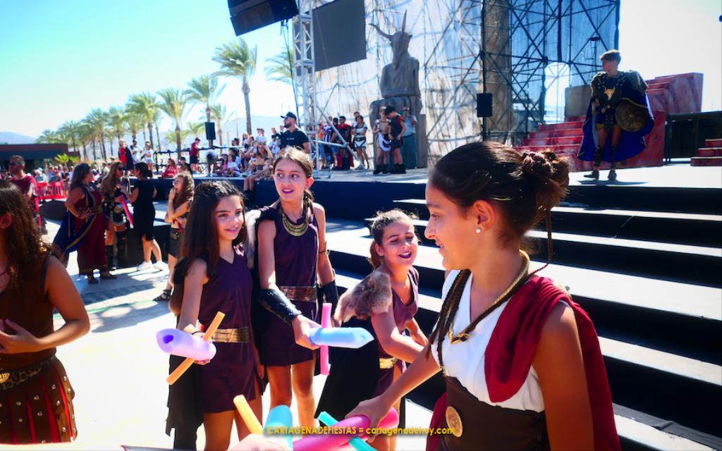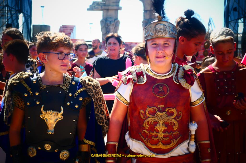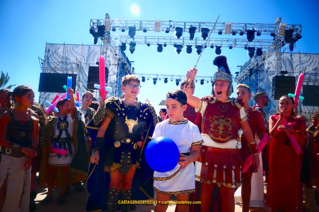 La brisa del mar ha envuelto este año la batalla infantil de Carthagineses y Romanos en el puerto de Cartagena, donde numerosos chavales de tropas y legiones han disfrutado con la representación y combate de la toma de la ciudad de Qart-Hadast.