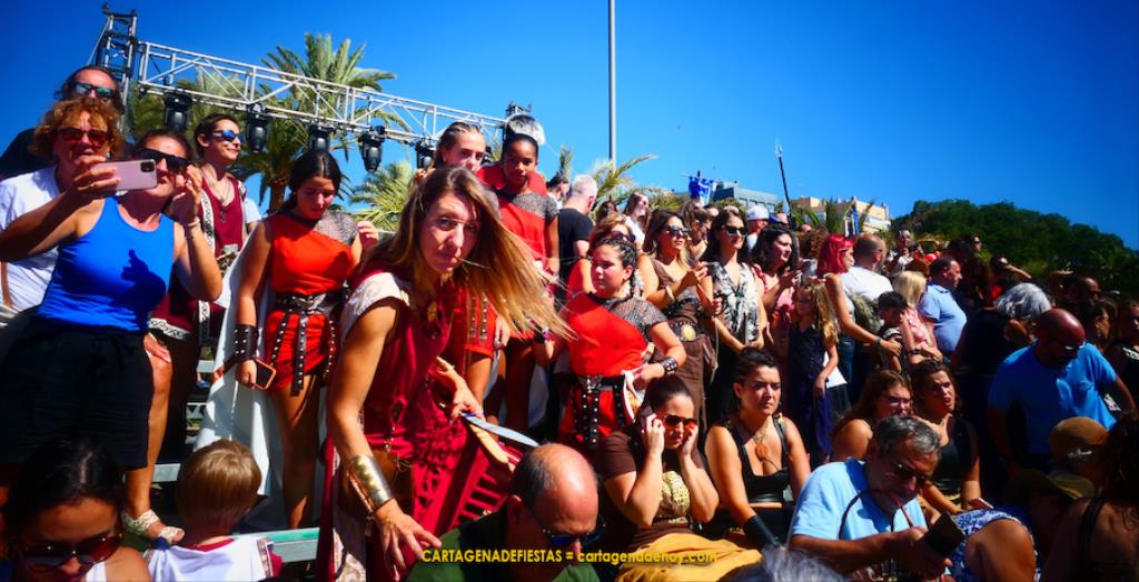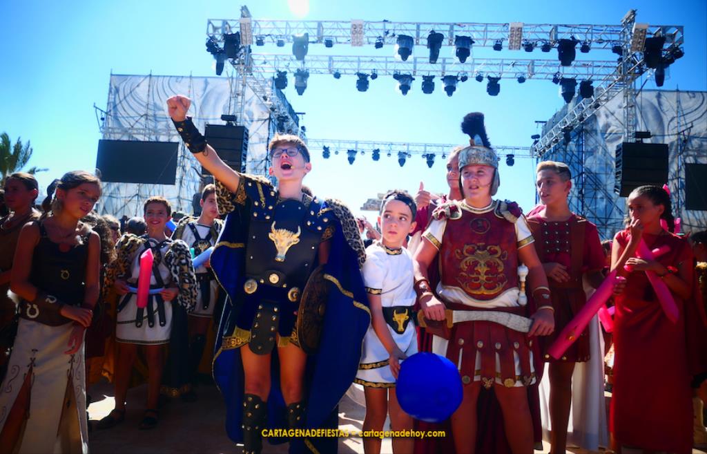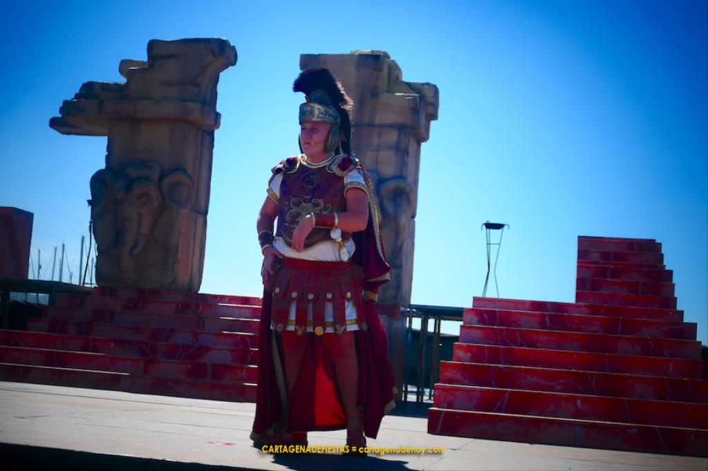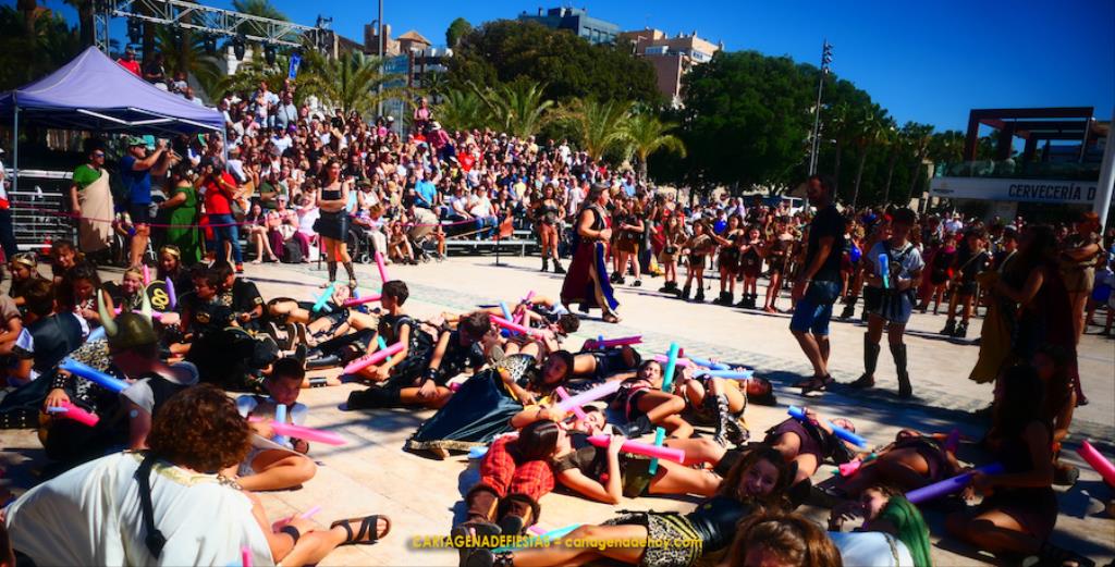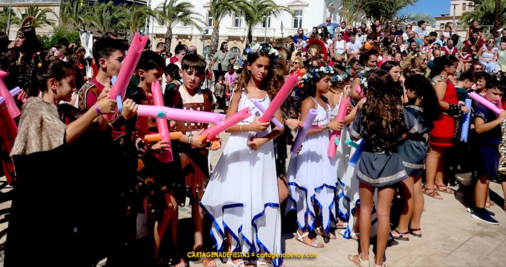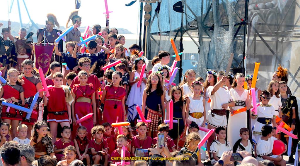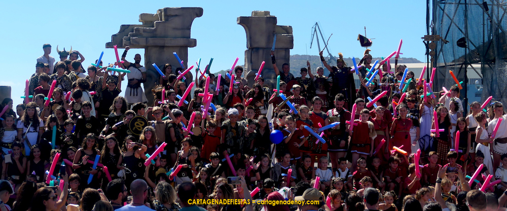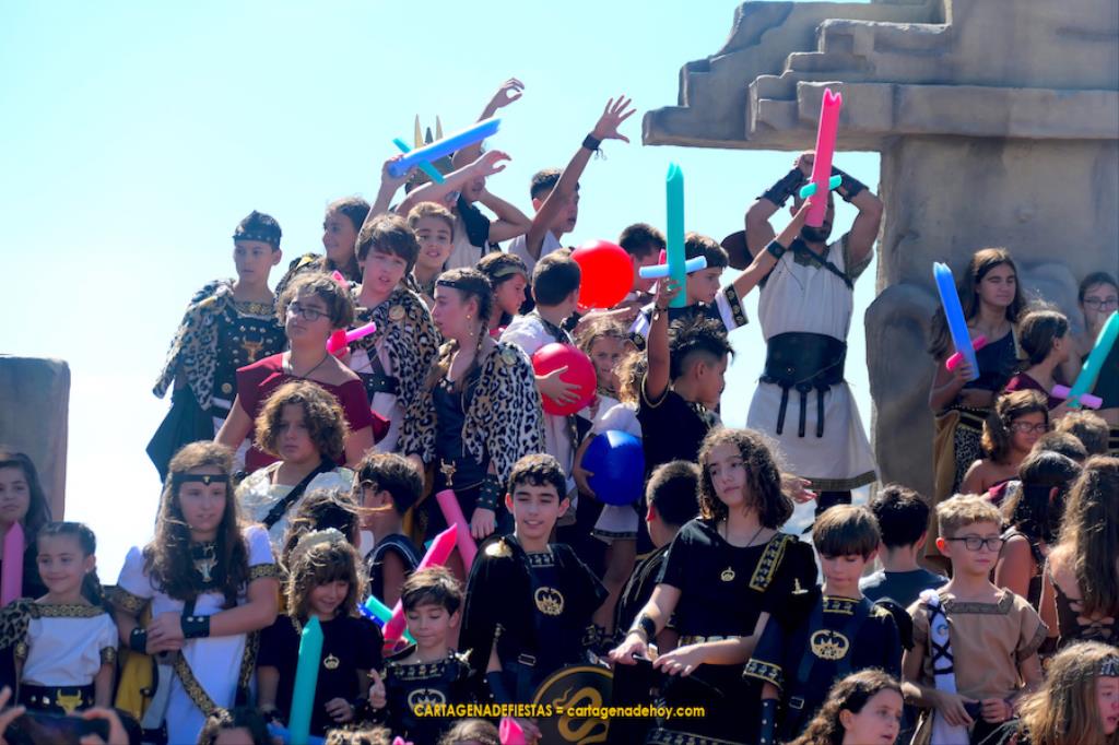 La brisa del mar ha envuelto este año la batalla infantil de Carthagineses y Romanos en el puerto de Cartagena, donde numerosos chavales de tropas y legiones han disfrutado con la representación y combate de la toma de la ciudad de Qart-Hadast.