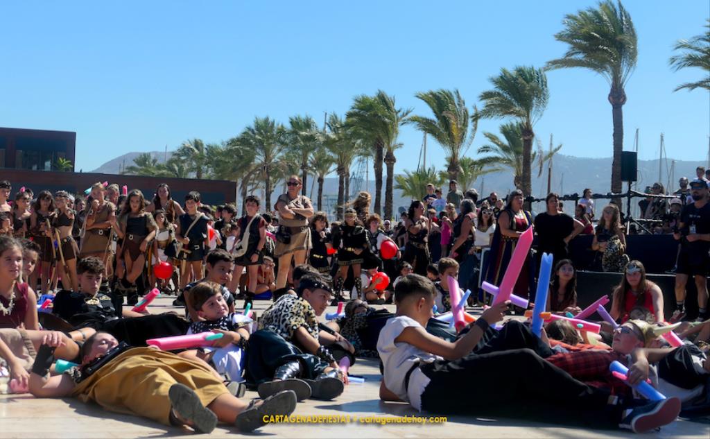 La batalla infantil está echando raíces. Comenzó celebrándose en la calle del fondo del campamento festero. Después pasó a la fachada exterior y este año se ha trasladado a la explanada del puerto, donde la mayoría de los comentarios es que ha lucido mucho en una soleada y algo ventosa matinal de jueves, día en el que otra 'batalla' (con la consejería de Educación) consiguió que este día fuera no lectivo para los escolares del municipio de Cartagena.
