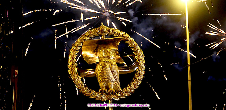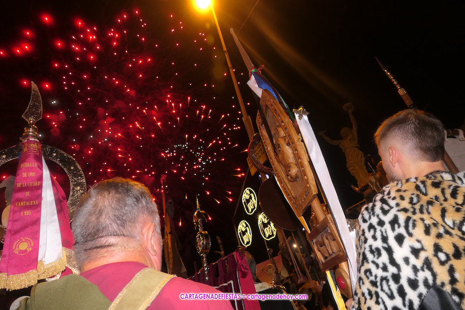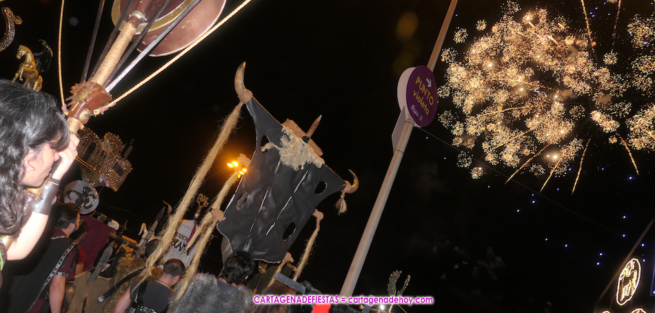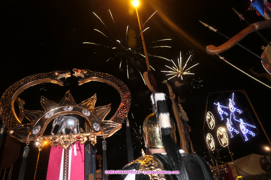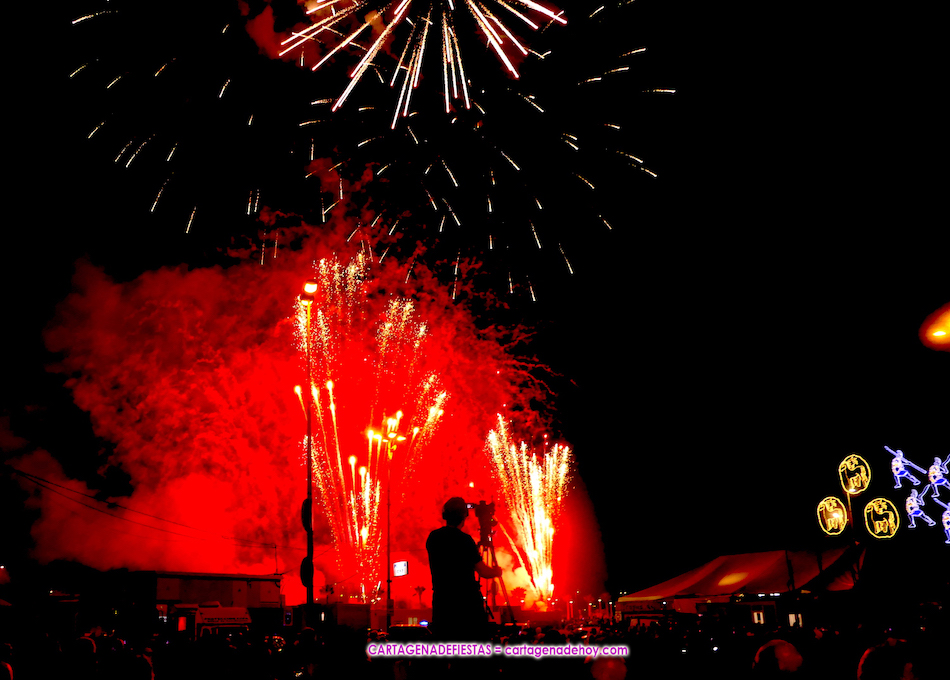 El castillo de fuegos artificiales ‘piromusical’ duró 18 minutos en el cierre de las Fiestas de Carthagineses y Romanos, siendo novedad de que se fueron escuchando diversas canciones durante su desarrollo, comenzando con música disco y pasando al rock para un final con ‘Los perros’ de ‘Arde Bogotá’, la banda cartagenera más de moda y de mayor éxito.