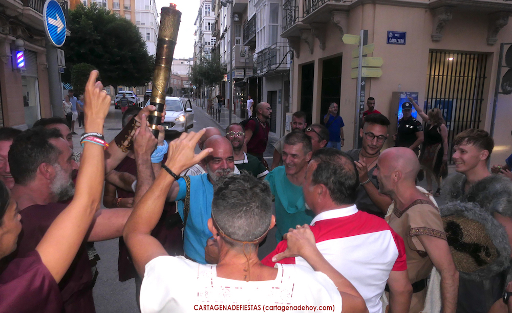 Los portadores de las dos antorchas con el fuego de Carthagineses y Romanos estallaron de júbilo ante la sede de la Federación de Tropas y Legiones cuando se encontraron las que llegaron ayer a Cartagena por tierra desde Santomera y la que lo hizo por mar desde Águilas después de haber cruzado las provincias de Jaén y Granada.