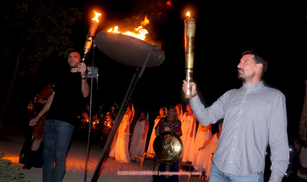Los dos exfutbolistas, quienes han dejado huella en el fútbol cartagenero, fueron los últimos portadores de las dos llamas sagradas en su primera escala en la ciudad, que después continuó, con otros protagonistas, en el Foro y el Teatro Romano, en una jornada con novedades en la puesta en escena y retraso en los tiempos fijados.