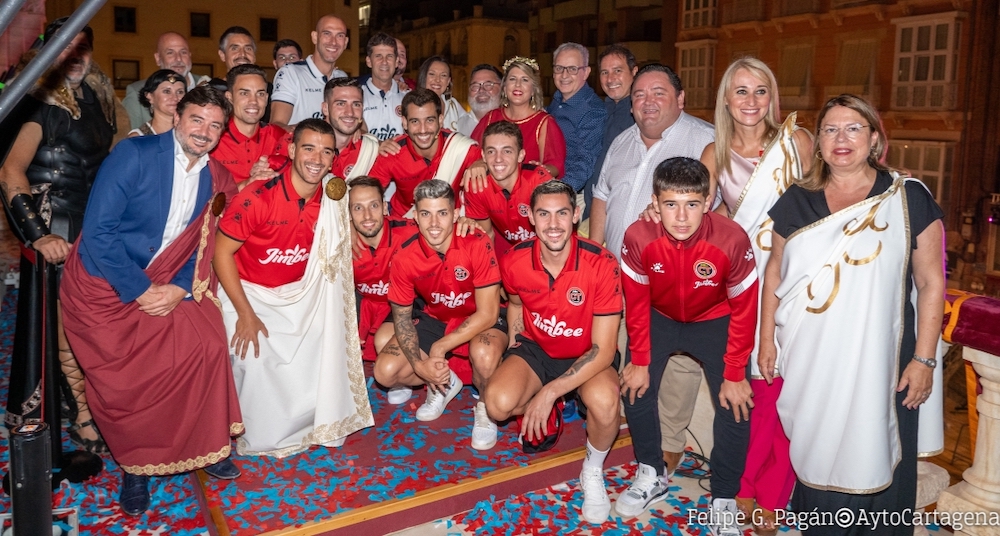 El pregón de los integrantes del Jimbee Fútbol Sala Cartagena pide a los cartageneros llenar las calles de "historia y orgullo". La alcaldesa recordó que ya no hay traslado de campamento y Odilo 'Cebé' recibió la distinción de 'Festero Honoris Causa' en un acto presentado por Óscar Martínez y en el que fueron presentadas tropas y legiones, junto a sus personajes.