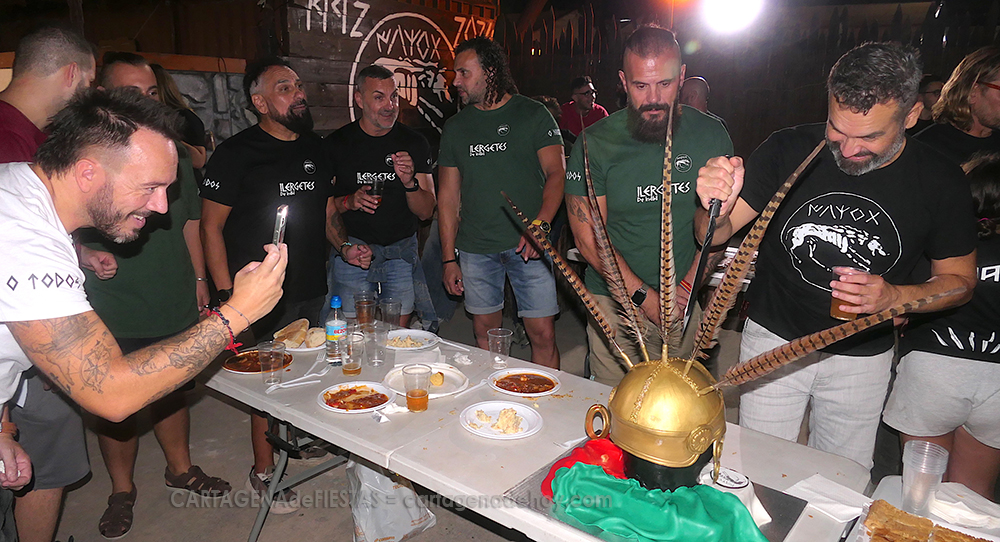 Jorge Preciado Vera, de Ilergetes de Indíbil de las históricas fiestas cartageneras, se encontró anoche, en la aldea del grupo en el campamento, con la gran sorpresa de una tarta con forma del tradicional casco con cinco plumas de la tropa.