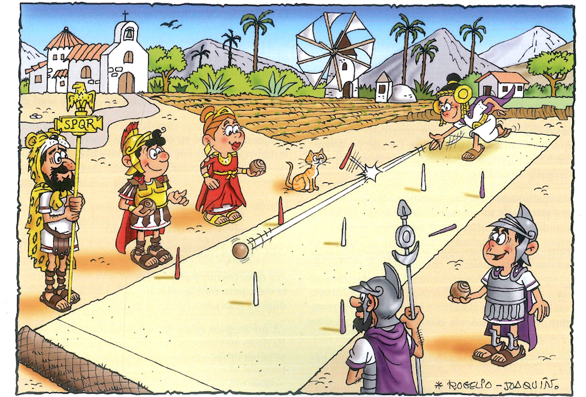 Los dos prestigiosos y populares dibujantes cartageneros ofrecen a Icue y Rascasote, quienes representan a los niños Aníbal y Escipión, y Flori y Cari (las pequeñas Himilce y Emilia Paula, respectivamente) disputando una partida del autóctono juego que espera ser en breve declarado de BIC (Bien de Interés Cultural).
