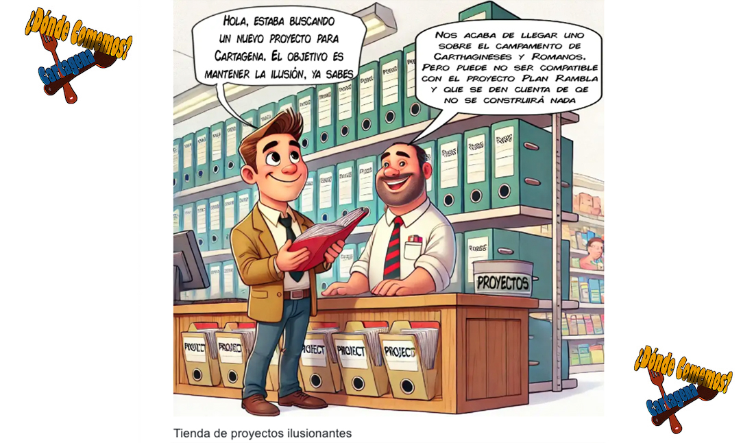 La semana pasada se anunciaba desde el gobierno local que los festeros pueden quedarse en el lugar donde está el actual campamento y que serán envueltos por un gran parque que acogerá concierto y exposiciones entre otros eventos. ¿Será realidad y no se verá afectado por el vecino proyecto urbanístico? Sobre este asunto gira la caricatura del portal ‘¿Dónde comemos?, Cartagena’, que dirigen Aida Belmonte y Enrique Costa.