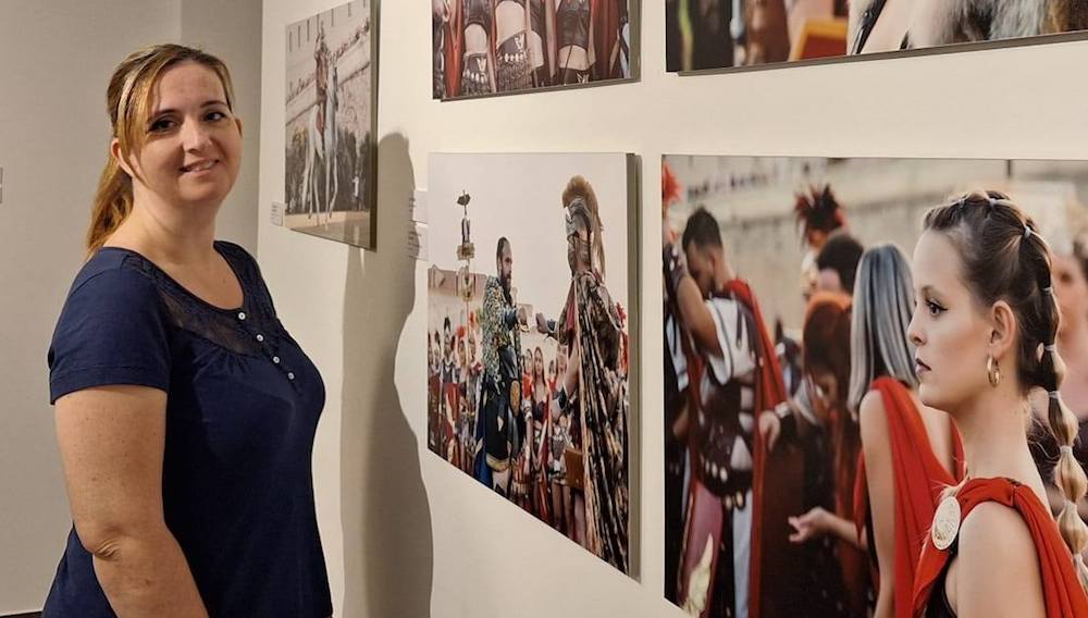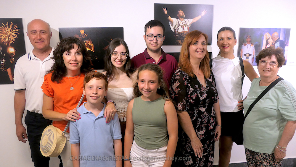 La fotógrafa cartagenera Carmen Martínez Martínez ha inaugurado 'Entre Qart Hadast y Carthago Nova', una exposición de veinte imágenes en las que se mezclan amor y guerra, las cuales estarán en el centro museístico hasta el 30 de septiembre. En la imagen adjunta se la observa posando con su familia ante varias fotografías.