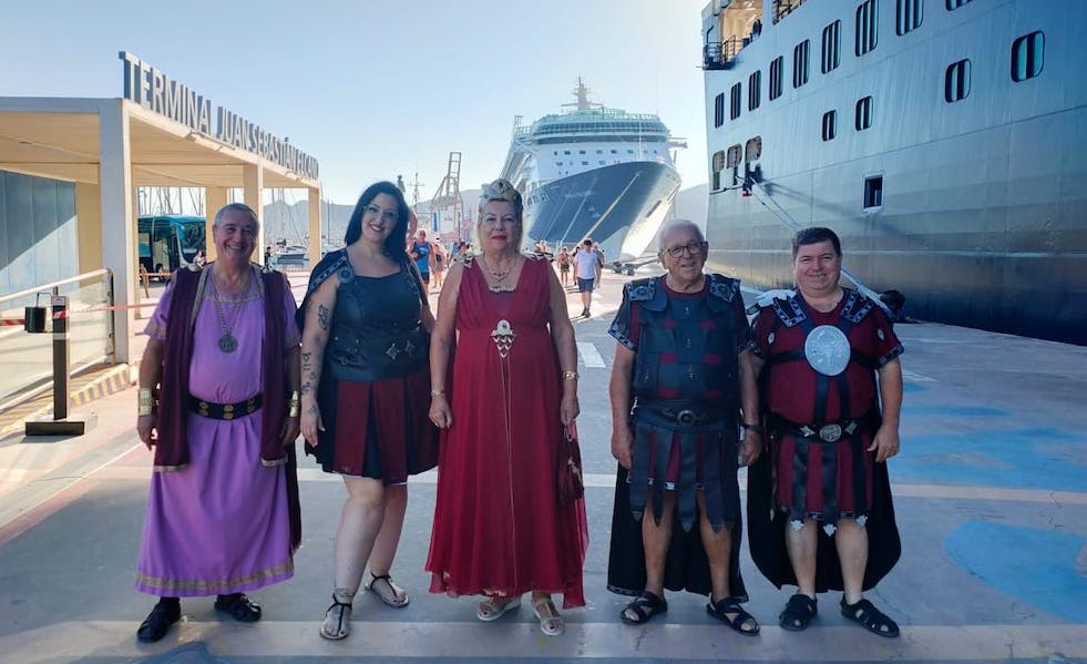 Cinco festeros de la tropa más antigua del bando púnico de Carthagineses y Romanos han enlazado los intensos diez días de fiestas con su fiel recibimiento a los pasajeros de los cruceros que atracan en Cartagena. En esta ocasión fue este lunes con los buques 'Queen Victoira' y 'Marella Discovery 2', que trajeron a más de cuatro mil quinientos turistas.
