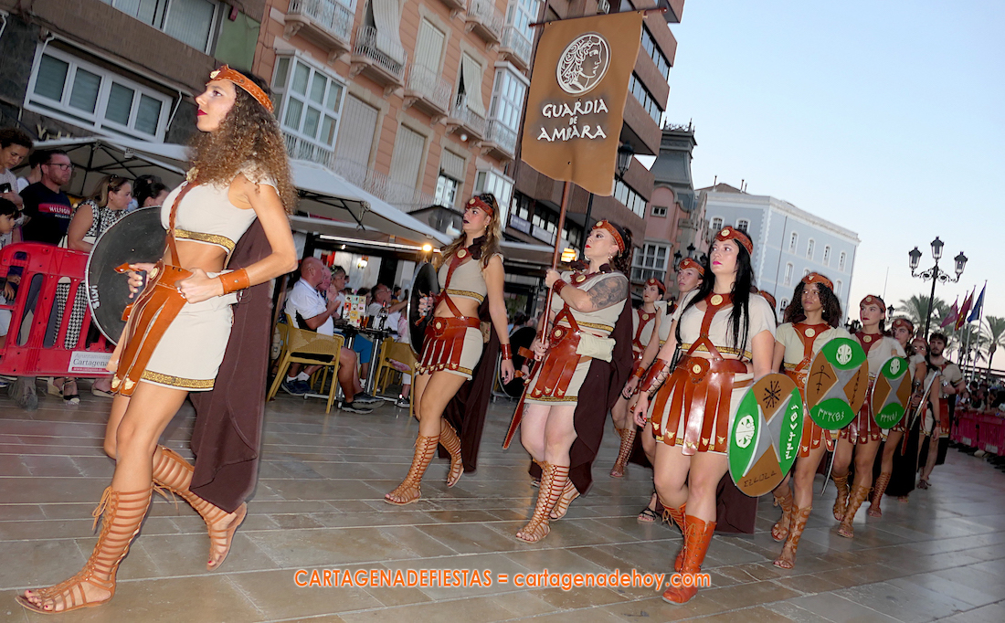 Las cincuenta tropas y legiones, con sus mejores galas y reforzadas por festeros de Alicante y de Linares, volvieron a ofrece una marcha que cautivó al numeroso público a su paso por las céntricas calles de Cartagena. En la foto, la guardia femenina de Indiketes.