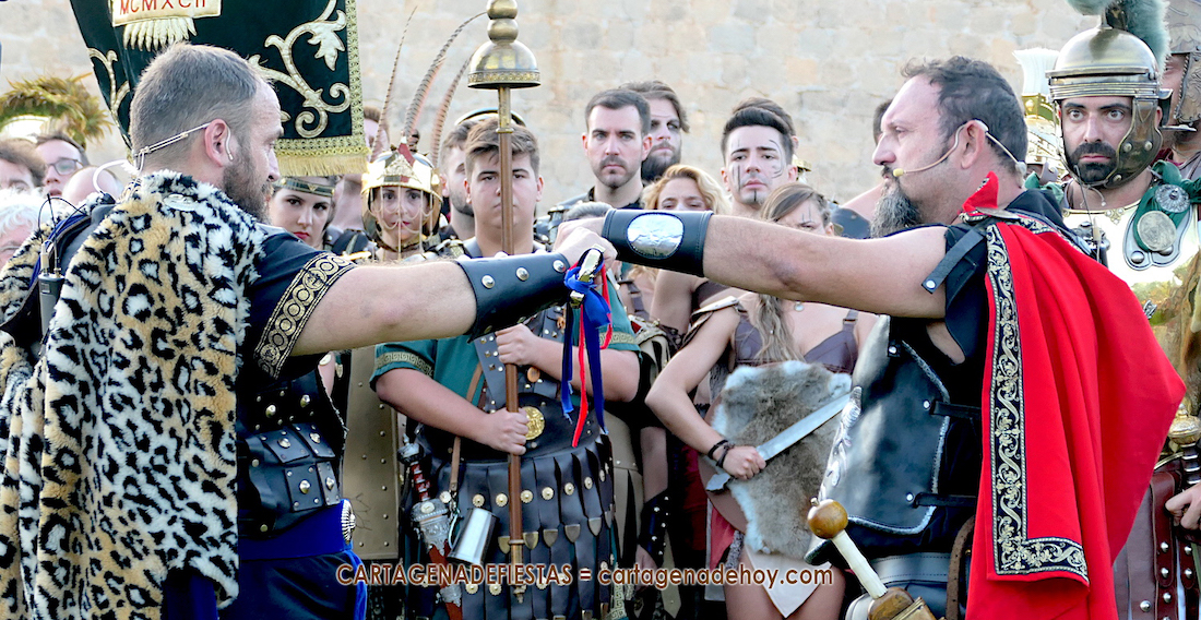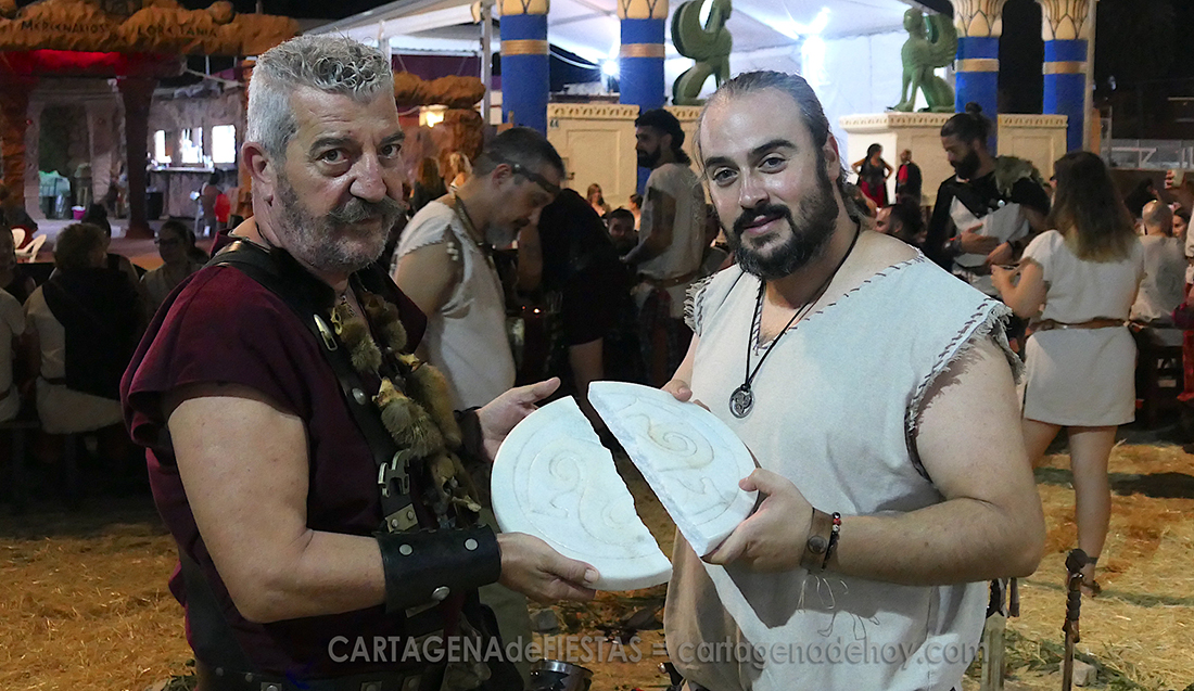 Las dos tropas carthagineses volvieron a estrechar lazos con una gran cena conjunta en el campamento en el once aniversario del hermanmiento que llevaron a cabo. En la foto, un integrante de cada bando muestra ‘la tesela de la amistad’, de la que dispone cada grupo de una mitad.