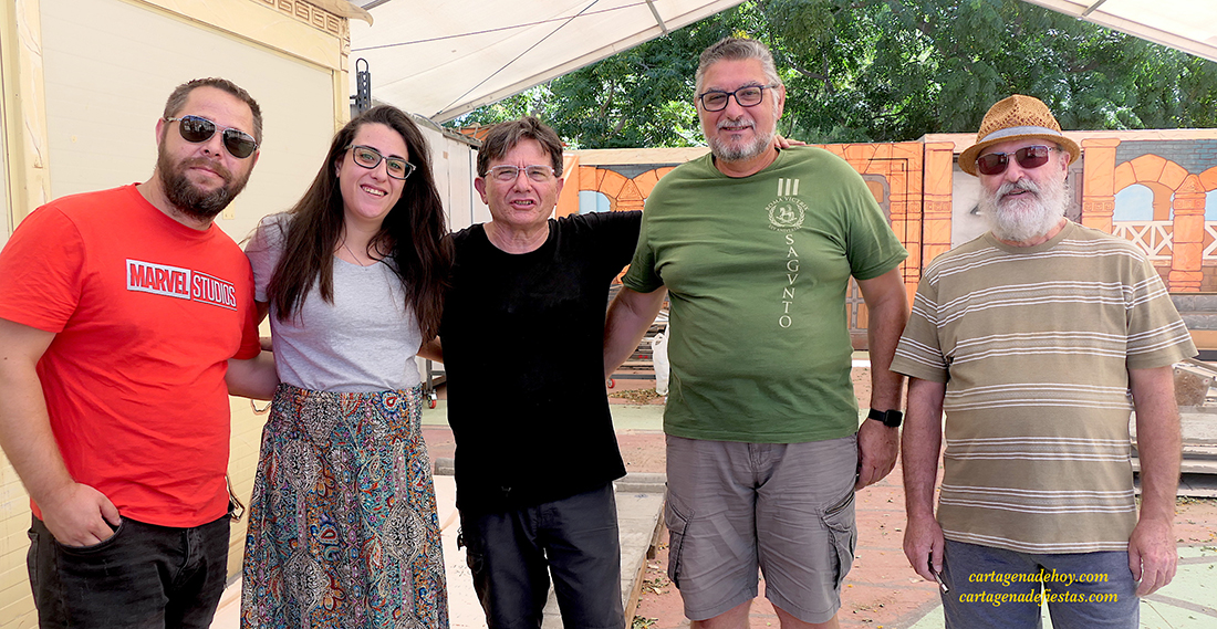 La legión de las Fiestas de Carthagineses y Romanos incorpora este año el rango de 'optio', que será encarnado por José Manuel Villagordo y que será el encargado de coordinar los desfiles. En la foto, cinco componentes del grupo que preside María Dolores Santander en los trabajos de montaje de su templo en el campamento, donde hay varias novedades.
