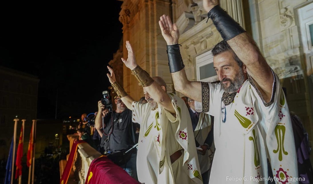 El Annus XXXIII de Carthagineses y Romanos ya ha llegado. Tras la llegada del fuego sagrado, la fachada del Palacio Consistorial acogió la entrega de la distinción de Festero Honoris Causa al Jimbee Cartagena Fútbol Sala, la presentación de personajes principales (adultos e infantiles), tropas y legiones, representación con disputas verbales y arengas, alocuciones de la alcaldesa y del presidente de la federación (inciden en disfrutar unas fiestas sin incidentes) y el pregón de Luis Zahera y Manuel Tafallé, poniendo el broche el canto del himno a Cartagena. Otro aliciente fue la proyección de rediseños de la fachada del edificio del Ayuntamiento, las cuales se repetirán sábado y domingo.