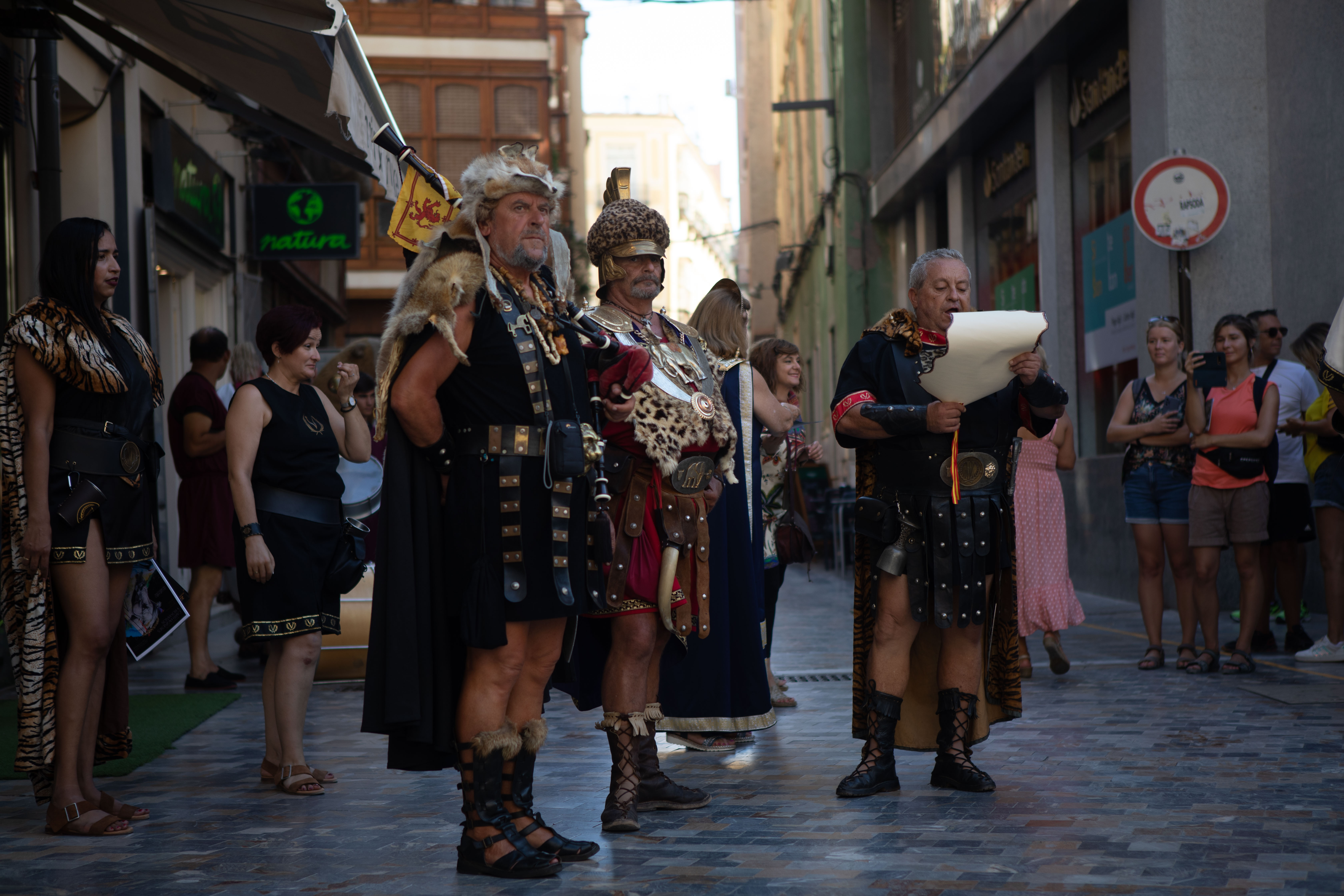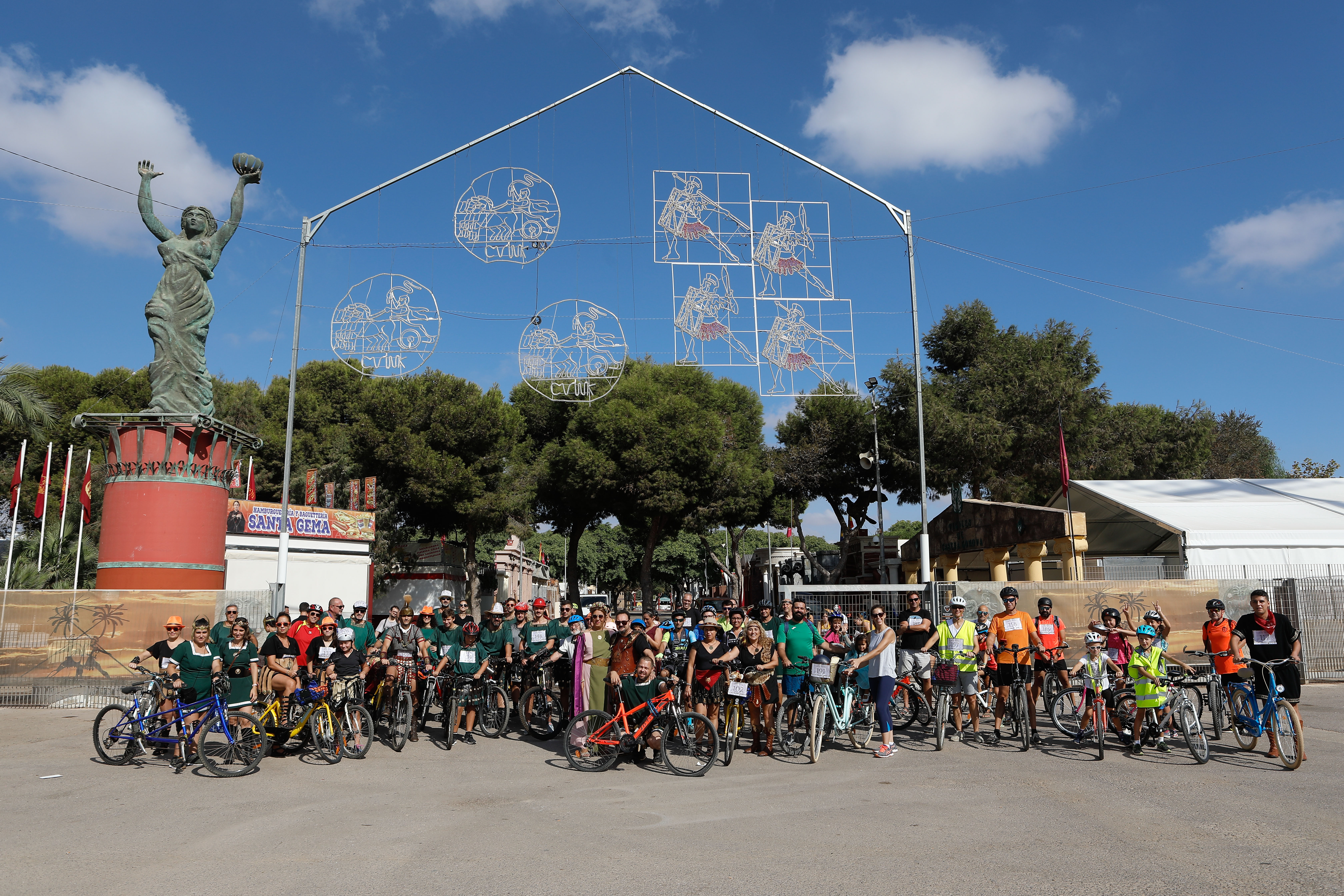 Hacia las 11 de la mañana, medio centenar de personas con sus bicicletas se han reunido a las puertas del campamento de Carthagineses y Romanos para empezar el recorrido de la Bici Romana. Vestidos con sus trajes de época, esperaban la salida del coche oficial para seguirlo en un recorrido por las calles principales del casco histórico y la fachada marítima de la ciudad.
