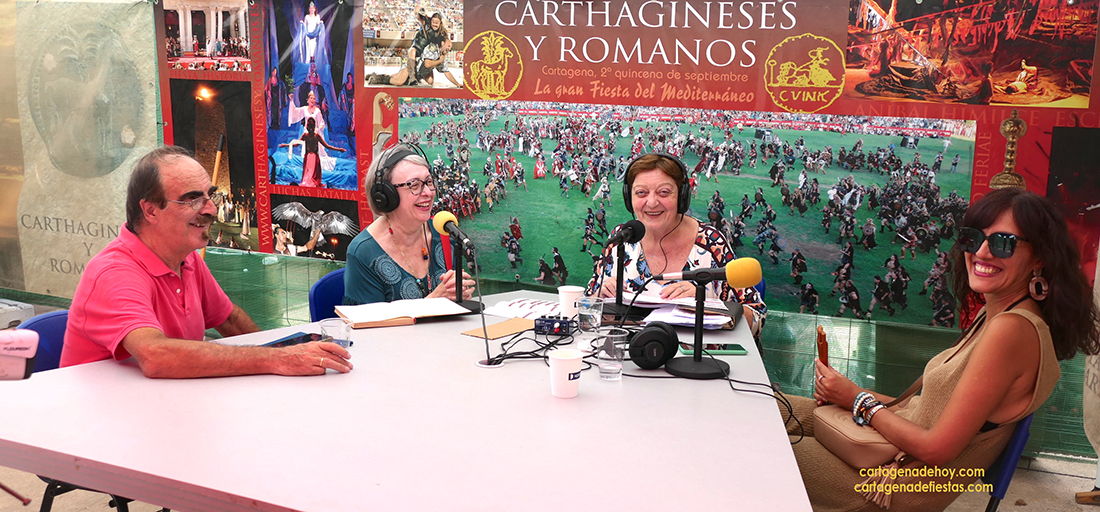 La emisora cartagenero se instaló en la gran aldea de Carthagineses y Romanos a principios de semana y desde dicho lugar ha emitido en directo los espacios matinales de ‘Caminando de la vida’ (incluida su tertulia), que dirige Pepe Cámara, y ‘Las mañanas de gaceta’, que presenta Chelo Cánovas, a quien se observa en la imagen durante la emisión de esta mañana y quien ha tenido hoy entre sus invitados a Alberto Castillo, presidente de la Asamblea Regional.