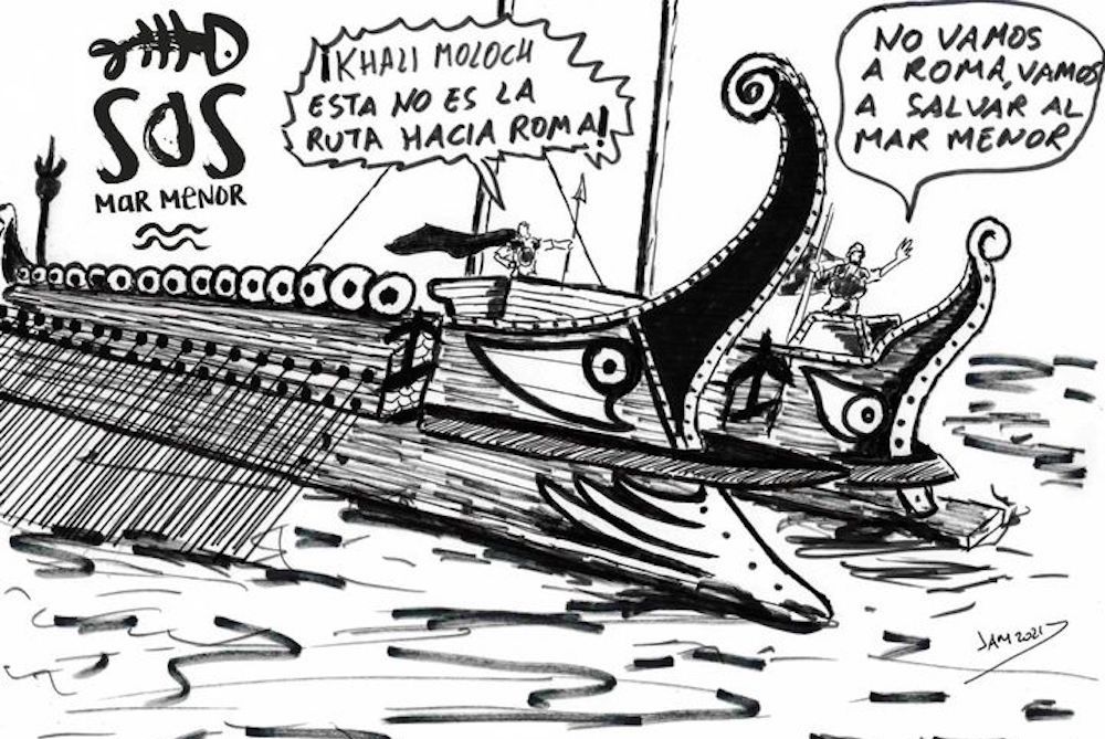 La tropa carthaginesa ha publicado en sus redes sociales esta viñeta de Joaquín Moya de la Torre Cerón en la que los personajes de Khali-Moloch y Birrabal ponen a sus naves, ante el SOS recibido, rumbo a la laguna salada para apoyar en la movilización ciudadana que exige su recuperación.