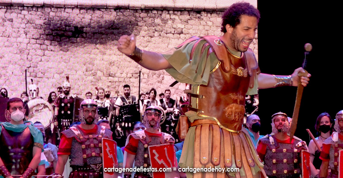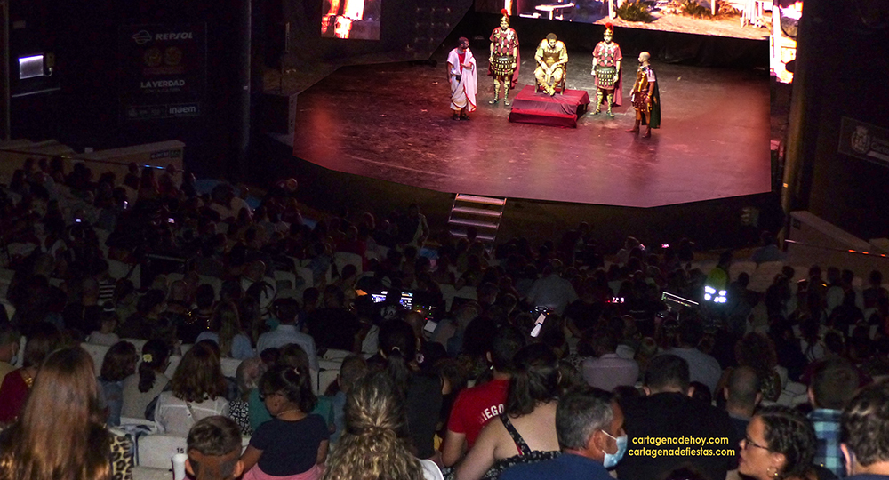 Fue otra forma de relatar la toma de Qart-Hadast por parte de Escipión y sus ‘águilas’. Más teatralizada,, con un ritmo estupendo en una sucesión de escenas cortas que cautivó a los espectadores. En apenas media hora ya había entregado Magón Giscón su falcata al romano (Adil Mata no pudo evitar al final emocionarse) y después se fueron ofreciendo los siguientes capítulos de la liberación de rehenes y de la implantación de la ley y costumbres romanas en lo que iba a ser Carthago-Nova. GALERÍA DE FOTOS (pinchar aquí)
