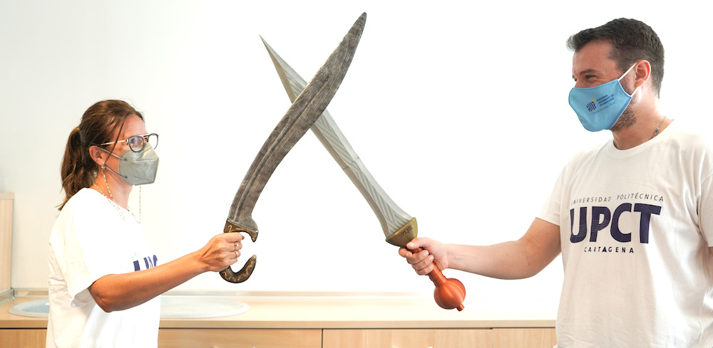 Lola Ojados y Héctor Flores con dos de las espadas impresas en 3D en el FabLab de la UPCT