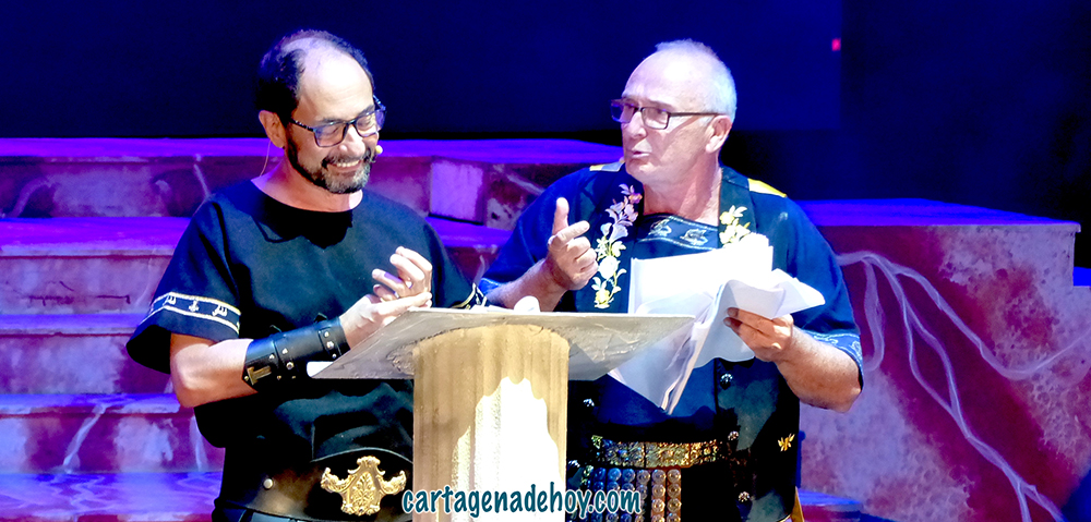 Jordi Sánchez y Xavier Deltell ofrecieron, durante dieciséis minutos, un ameno pregón de inicio de las Fiestas de Carthagineses y Romanos, en el que recurrieron a al eterna rivalidad entre Cartagena y Murcia. En el ágil diálogo entre ambos, ‘el pescadero de La que se avecina’ introdujo sus populares frases de la serie televisiva, lo que fue muy aplaudido por parte de los que se dieron cita en el auditorio del Parque de Torres en una velada que cerró el buen humor del malagueño Miguel Angel Martín.