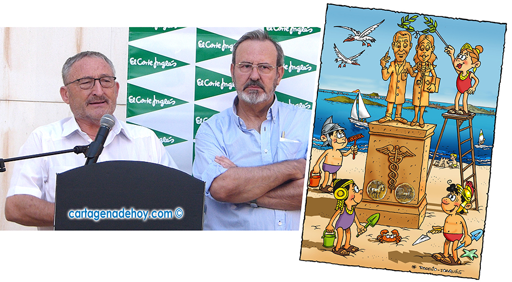 Los dos populares dibujantes cartageneros dedican la viñeta del Annus XXXII de las históricas fiestas a médicos, enfermeras, auxiliares y a todo el personal de la sanidad que ha estado trabajando para tratar de frenar el impacto de la pandemia del COVID-19 en nuestra sociedad. Icue, Flori, Rascasote y Cari, los niños que representan a los principales personajes festeros, aparecen en la playa creando un monumento de arena a este gremio.
