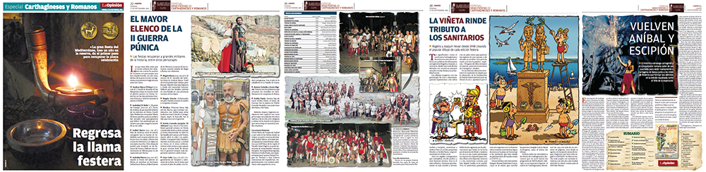 Joaquín Moya de la Torre y Cerón, festero de Tropas de Magón y cronista oficial festero, protagoniza la exposición de treinta y siete viñetas sobre Carthagineses y Romanos que acoge El Corte Inglés, en la que los simpáticos textos y gestos arrancan numerosas sonrisas. El organizador de la muestra es su compañero Lorenzo Jerez. Estas obras surgieron durante el confinamiento por la pandemia: "Querían hacer reír a personas que estaban solas", explica.