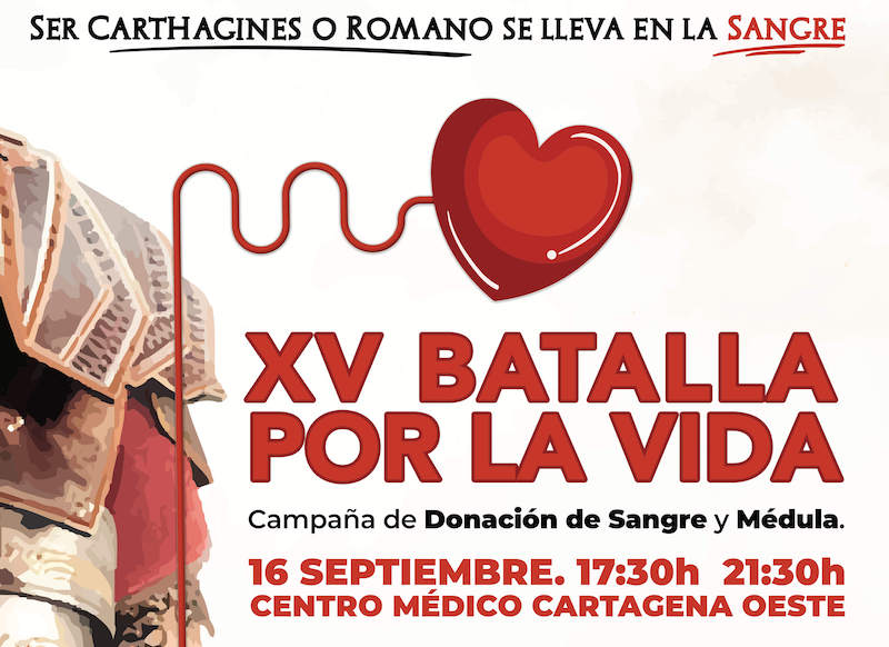 La Federación de Tropas y Legiones de Carthagineses y Romanos y el Centro Regional de Hemodonación, con la colaboración del Ayuntamiento de Cartagena, organiza la décima edición de la donación de sangre y médula el jueves 16 de septiembre en el centro de salud del Barrio de la Concepción por la tarde. El edil Juan Pedro Torralba remarca que la donación de sangre "ha estado contra las cuerdas en más de una ocasión durante el último año y medio", por lo que necesita la ayuda ciudadana.