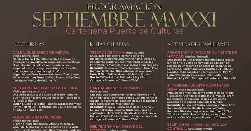 Este año, Cartagena celebra sus fiestas de Cartagineses y Romanos del 17 al 26 de septiembre, en el Año de la Esperanza. Desde Cartagena Puerto de Culturas nos sumamos a las mismas con una programación especial que quiere acercar a los ciudadanos a un momento histórico crucial para la historia de nuestra ciudad, como es la II Guerra Púnica en los escenarios donde tuvieron lugar algunos de los episodios más destacados.