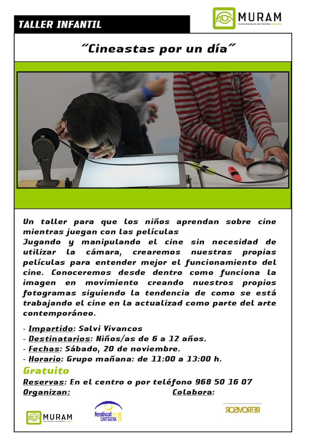 - Taller de cine para niños/as "Cineastas por un día" (20 de noviembre) . Completo, lista de espera.