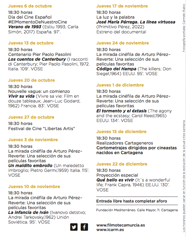 La programa de octubre y noviembre incluye la proyecciones de películas seleccionadas por el periodista y escritor cartagenero, como 'Un maldito embrollo', 'a infancia de Iván', 'Código del hampa' y 'El tormento del éxtasis' en el aula 'Ramos Carratalá' de la Fundación Mediterráneo, en la calle Mayor, donde también se podrán ver 'Verano de 1993', 'Los cuentos de Canterbury', 'Vivir su vida' y 'Qué bello es vivir'. La entrada es gratuita.