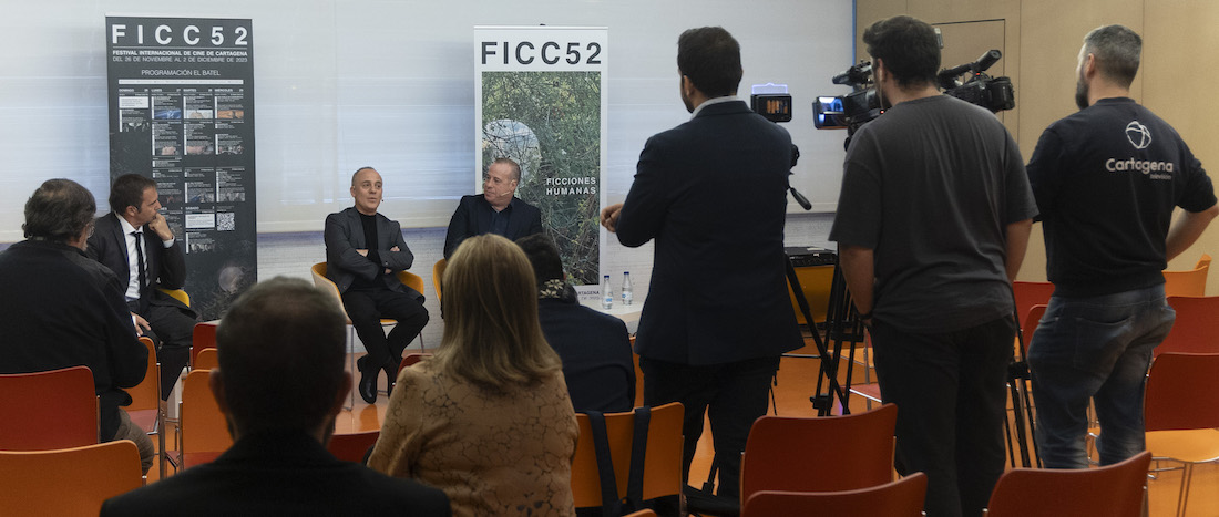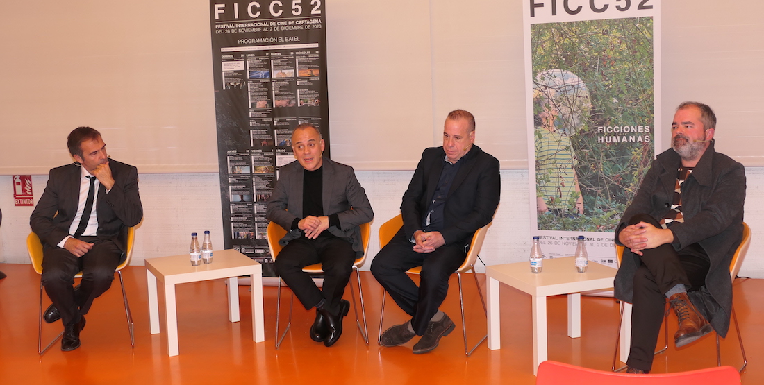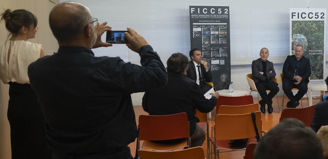 El Festival Internacional de Cine de Cartagena habilitó un encuentro de la prensa con Javier Gutiérrez, actor premiado en esta 52 edición del FICC y que también ha venido a promocionar la película ‘Honeymoon’, que se estrenará en los cines de España el próximo 12 de enero y que en El Batel tuvo la ocasión de ser visionada por los asistentes a la gana de clausura del festival. En esta sala de prensa también estuvieron su director, Enrique Otero, y el productor, Xacobe Sineiro, además del presidente del FICC, Nacho Ros.