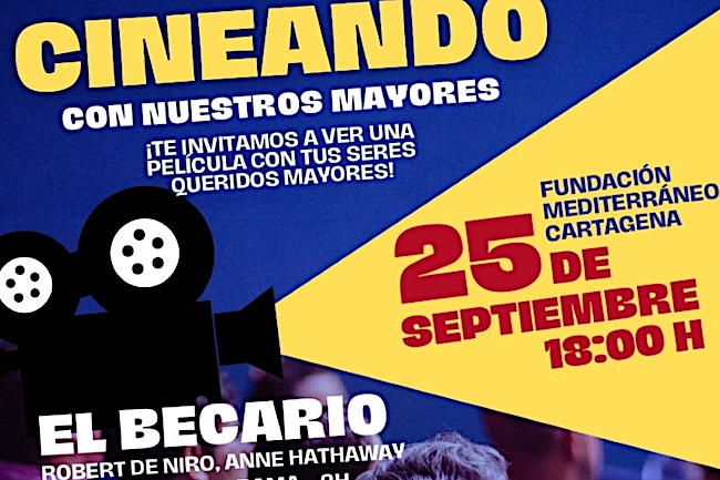 Fundación FADE, en el marco de su proyecto 'Acompañando' con la colaboración del Ayuntamiento de Cartagena, organiza la actividad 'Cineando con nuestros mayores' para el miércoles 25 de septiembre por la tarde en la Fundación Mediterráneo de Cartagena, donde se podrá ver la película 'El becario', una comedia protagonizada por Robert de Niro y Anne Hathaway. Abierta la inscripción para asistir.
