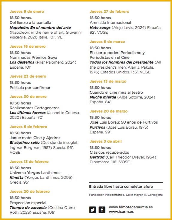 Filmoteca de Cartagena da a conocer su programación de los jueves hasta el 3 de abril en la Fundación Mediterráneo, figurando desde una película dedicada a los fareros de Cabo de Palos hasta clásicos como 'Furtivos', pasando por películas extranjeras en versión original subtitulada como 'Napoléon: en el nombre del arte', 'El séptimo sello' y 'Todos los hombrs del presidente'.