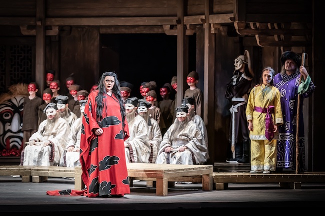 La última ópera de Puccini se ha convertido en sinónimo de la entrañable aria «Nessun Dorma» cantada cuando Calaf espera conseguir la mano de la princesa. La puesta en escena de Șerban -una de las más espectaculares del repertorio de The Royal Opera- transporta al público a un mundo bello pero despiadado, realzado por un ambiente cinematográfico. Los coloridos decorados y el vestuario de Sally Jacobs se inspiran en la antigua cultura china, reflejando las melodías tradicionales chinas entretejidas en la partitura.