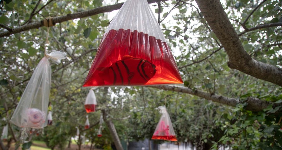 Capitaneados por los profesores Manuel González López y María José Ruiz Vivancos, los alumnos de 1º y 2º de ESO del Colegio La Inmaculada han creado 'Los Frutos del Progreso', donde se pueden observar agonizantes peces nadando en sangre. Lo que pueden llegar a ser nuestros mares y océanos. Micro obras en forma de pez, realizadas con materiales reciclados, dentro de bolsas de plástico. Al finalizar la exposición, se convertirán en macetas. Plaza de los Juncos.