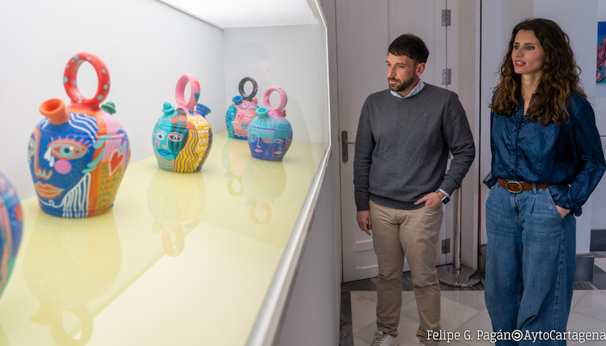 La muestra que acoge el Palacio Consistoria representa esa “exigencia que viven las madres y las mujeres en general por estar al pie del cañón todo el tiempo, en muchos ámbitos de la vida”, explica la pintora cartagenerea Victoria Soto ('Mademoiselle Chocolat') sobre las obras que ofrece en cuadros y botijos.