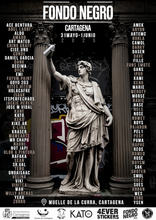 Se realizará el sábado 31 de mayo en el muro del rompeolas del acceso al Faro de la Curra, en colaboración con la Autoridad Portuaria. El nombre Fondo Negro, hace referencia al color más comúnmente utilizado como fondo en los murales de arte urbano, lo que resalta aún más los colores utilizados en las piezas, atrayendo así la atención de los visitantes.