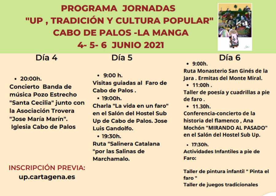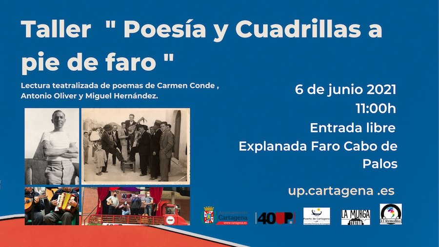 Por último, el domingo comenzará a las nueve de la mañana con una visita al Monasterio de San Ginés de la Jara y las Ermitas del Monte Miral. Correrá a cargo de la Asociación de Amigos de este enclave. A las 11.00 horas, junto al faro La Murga Teatro y la cuadrilla Emilio de Patiño ofrecerán un taller de poesía a los pies del faro de Cabo de Palos.