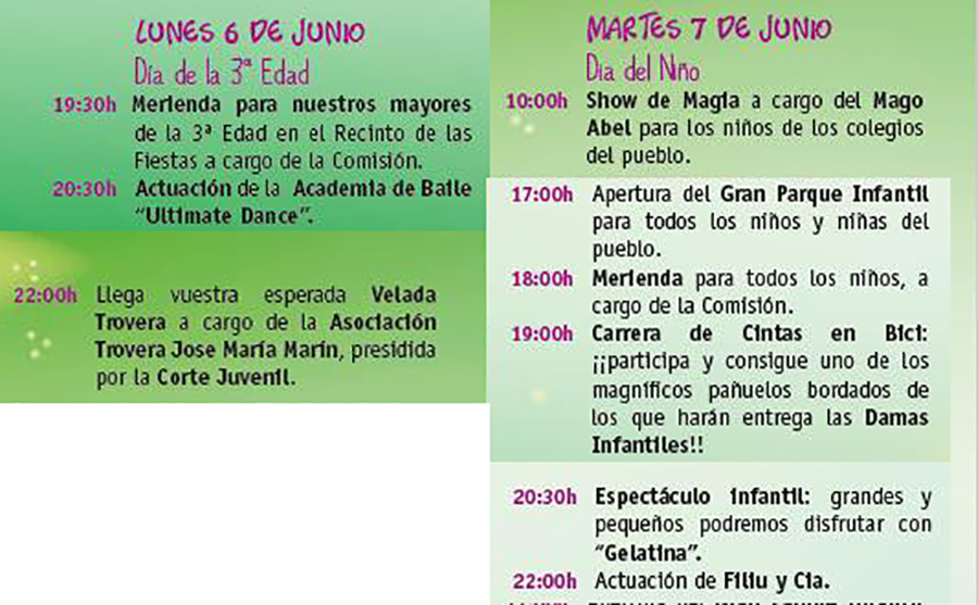 Los festeros han arrancado con gran éxito de asistentes, en sus tres primeras jornadas, como reflejan las fotografías de este artículo de la noche del pregón y la de humor de anoche. Hoy hay actuación de academia de baile y velada trovera (22 horas), mientras que mañana la actividad comienza con Abel Mago por la mañana y culmina, después de las actividades infantiles de la tarde, con el concierto de Filiú y Cía por la noche.